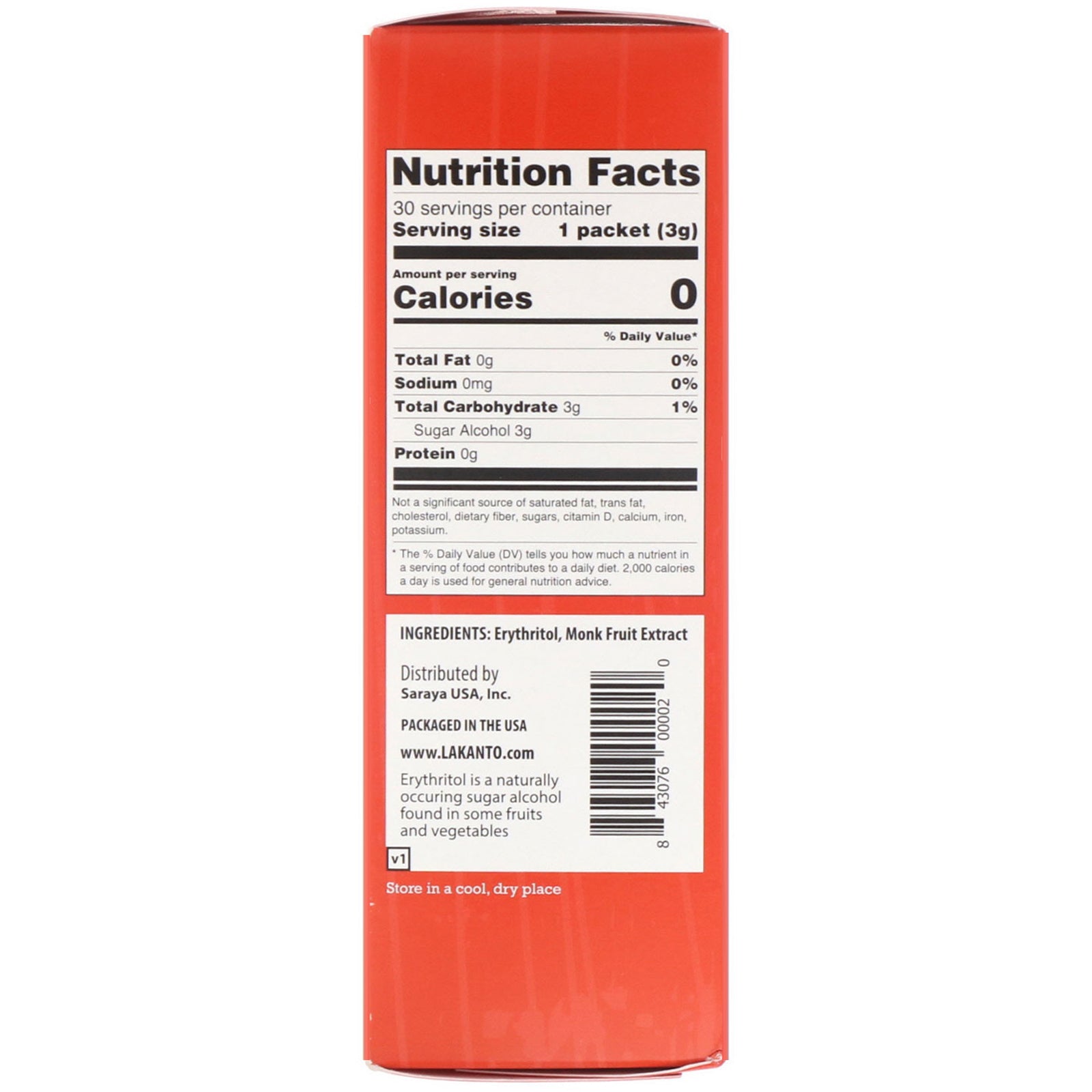 0 Net Carbs Ketogenic Non GMO Project Verified Zero Calories Zero Glycemic 2x Sweeter Than Sugar Zero Additives Vegan Gluten Free Zero Aftertaste One Packet = 1 1/2 Teaspoons Sugars Over a Thousand Years Ago In the remote mountain highlands of Asia, a group of Buddhist monks called the Luohan achieved enlightenment and ascension through meditation, prayer and pure living. On the slopes of a primeval forest, the monks discovered and cultivated a rare fruit prized for its sweetness. This sacred fruit was named Monk Fruit, or Luohan Guo, after its devoted caretakers and was used in elixirs to raise chi, or life energy. Monk Fruit was used for centuries in eastern traditional herbalism to increase chi and well-being, earning it the nickname "The Immortals' Fruit". We still grow and harvest Monk Fruit for Lakanto in the same pristine area and according to traditional and environmental methods. Born from a proprietary mixture of high-purity Monk Fruit extract and Non GMO Erythritol, Lakanto is a delicious zero calorie, zero glycemic sweetener with the sumptuous rich taste of sugar.