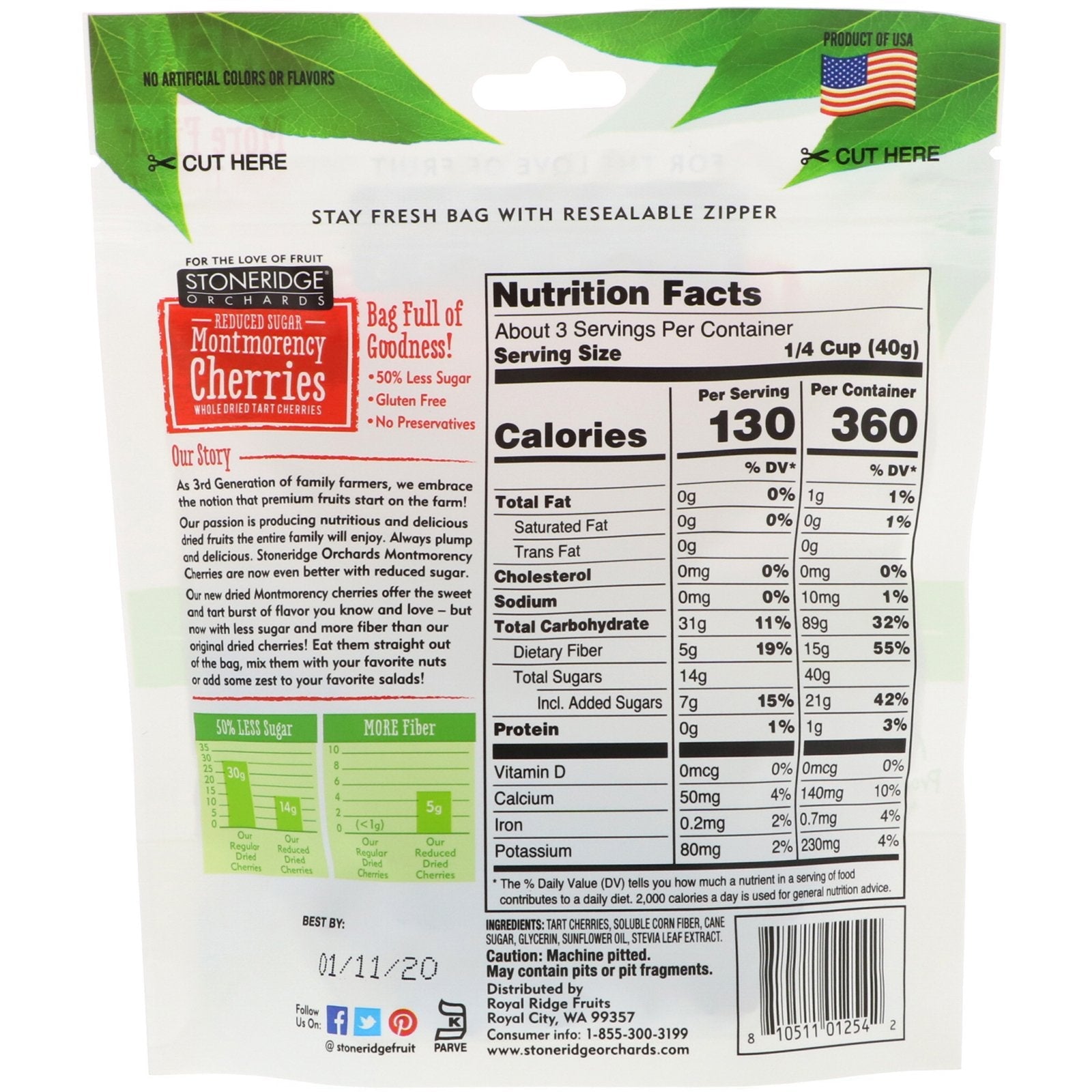 More Fiber. Better Than Ever. For the Love of Fruit Whole Dried Tart Cherries 50% Less Sugar Than Our Regular Dried Cherries Gluten Free No Preservatives Kosher Parve Non-GMO Project Verified No Artificial Colors or Flavors Stay Fresh Bag with Resealable