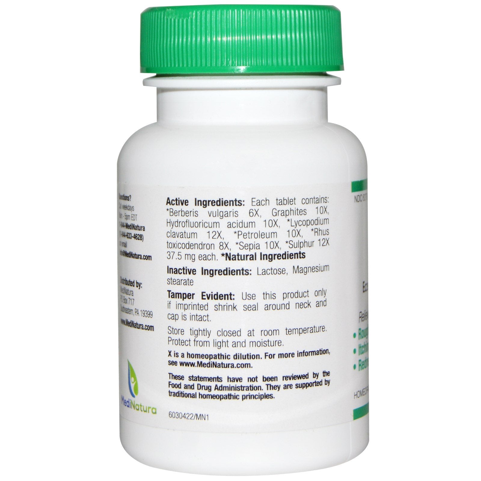 Homeopathic Relieves: Rough Scaly Skin Itching Skin Redness Uses: For the temporary relief of minor eczema symptoms: rough scaly skin, itching skin, redness.Sugg. UseAt first sign of symptoms: Adults and children 4 years and older: 1 tablet every 1/2 to 1 hours until symptoms lessen, then continue with standard dosage. Do not exceed 12 tablets in 24 hours. Standard dosage: Adults and children 4 years and older: 3 tablets per day, taking 1 tablet every 4 to 6 hours. For children under 4 , consult your health professional. Allow tablets to dissolve completely in the mouth, do not swallow.Other IngredientsActive Ingredients: Each tablet contains: *berberis vulgaris 6X, graphites 10X, hydrofluoricum acidum 10X, *lycopodium clavatum 12X, *petroleum 10X, *rhus toxicodendron 8X, *sepia 10X, *sulphur 12X 37.5 mg each. *Natural Ingredients Inactive Ingredients: Lactose, magnesium stearate X is a homeopathic dilution.Supplement FactsDisclaimerWhile VitaminsUK strives to ensure the accuracy of its product images...