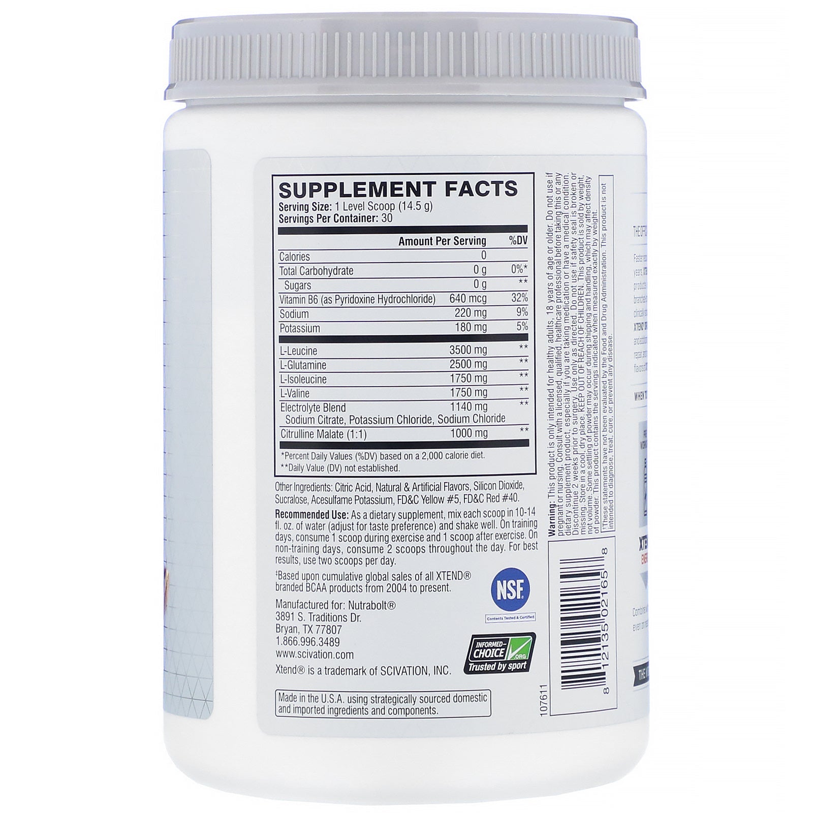 Serving Size: 1 Level Scoop (14.5 g) Servings Per Container: 30 Amount Per Serving %Daily Value Calories 0 Total Carbohydrate 0 g 0%* Sugars 0 g ** Vitamin B6 (as Pyridoxine Hydrochloride) 640 mcg 32% Sodium 220 mg 9% Potassium 180 mg 5% L-Leucine 3500 mg ** L-Glutamine 2500 mg ** L-Isoleucine 1750 mg ** L-Valine 1750 mg ** Electrolyte Blend Sodium Citrate, Potassium Chloride, Sodium Chloride 1140 mg ** Citrulline Malate (1:1) 1000 mg ** *Percent Daily Values (%DV) based on a 2,000 calorie diet. **Daily Value (DV) not established.Disclaimer