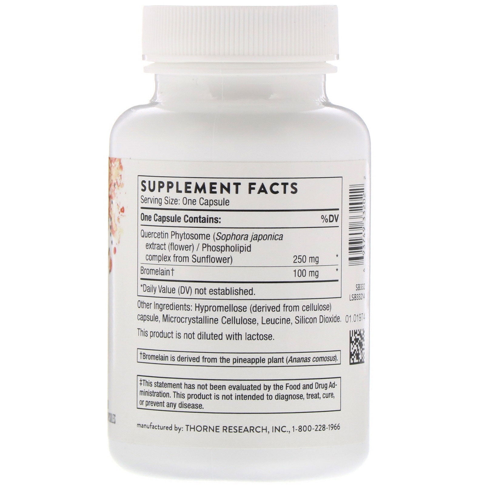 Dietary Supplement Respiratory Support Wound / Injury Gluten Free T Exclusive Quercetin, one of the two primary ingredients in Quercenase, stabilizes the body's mast cells, which store and release histamine, so it supports individuals who suffer from allergies. Quercetin appears to have many other beneficial effects on human health, including protection of the gastrointestinal tract and the cardiovascular system, where it scavenges free radicals and inhibits oxidation of LDL cholesterol. Thorne's Quercenase combines quercetin phytosome (quercetin bound to sunflower-sourced phospholipids, which increases the body's ability to absorb the quercetin) and bromelain, a compound of protein-digesting enzymes derived from the pineapple plant. Bromelain also has immune-enhancing properties because it contains constituents that help maintain a healthy cytokine balance.* Bromelain helps reduce bruising and swelling after an injury or surgery. A number of quercetin's positive effects appear to be due to its antioxidant activity. By itself, and paired with vitamin C, quercetin can reduce the incidence of oxidative damage to the skin and nerves caused by the natural depletion of glutathione. The advantage of quercetin phytosome is its advanced phytosome technology. Phytosome complexes are created by a patented process that binds a botanical extract to a phospholipid, which are key components of every cell membrane. Bromelain, which is a mixture of proteolytic (protein-digesting) enzymes from the pineapple plant (Ananas comosus), has been shown to promote healing and reduce temporary and minor swelling and bruising following an injury or a surgical procedure – including dental surgery. One study of patients with bone fractures found bromelain decreased swelling. Bromelain exerts some of its positive effects because of its significant proteolytic activity. Plastic surgeons have shown interest in bromelain because of its ability to increase the resorption rate of hematomas following surgery.