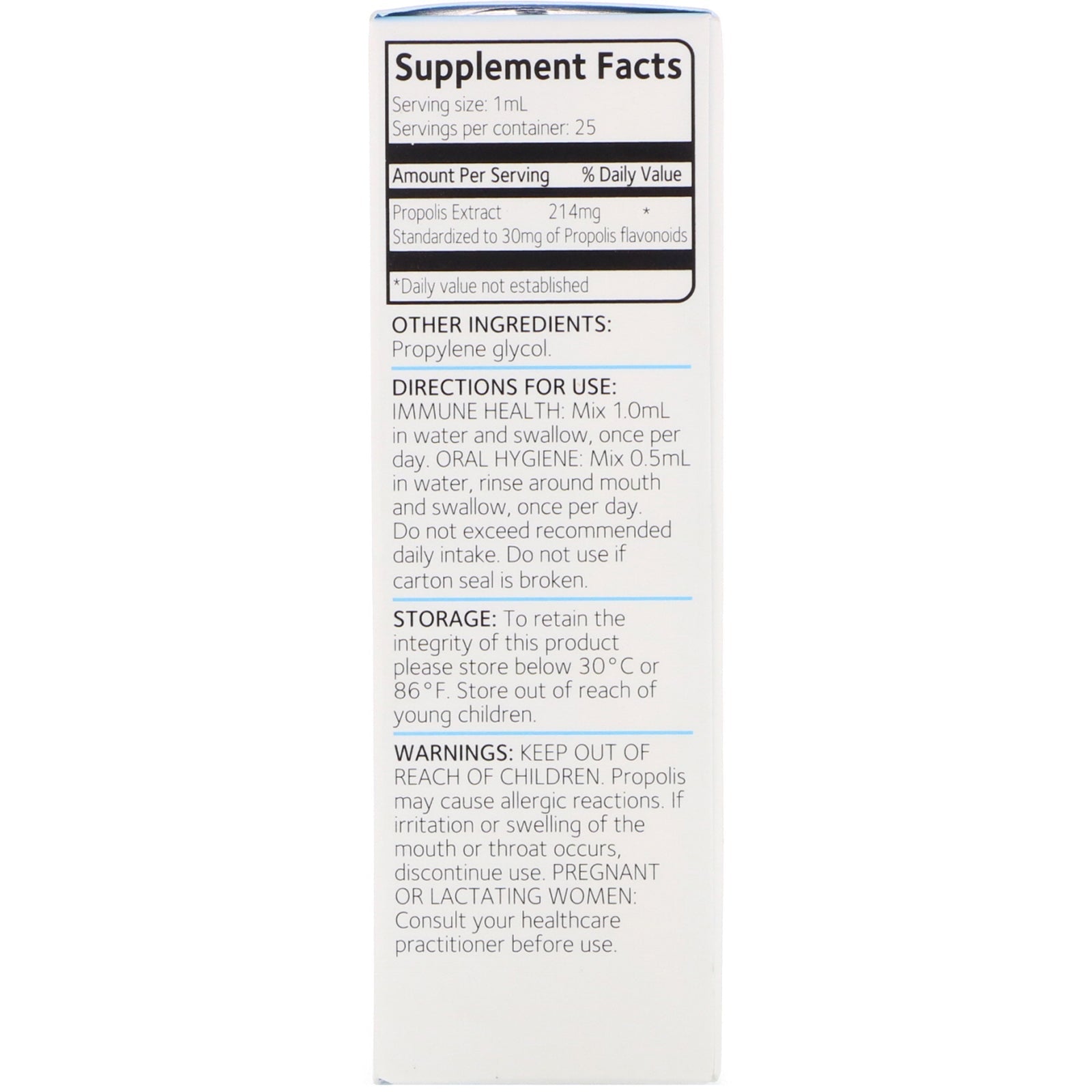 Serving Size: 1 ml Serving Per Container: 25 Amount Per Serving %Daily Value* Propolis Extract Standardized to 30 mg of Propolis flavonoids 214 mg * * Daily Value not established.