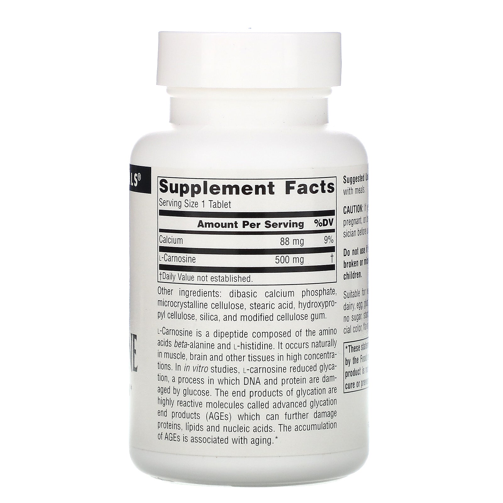 Dietary Supplement Reduces Glycation Suitable for Vegetarians L-Carnosine is a dipeptide composed of the amino acids beta-alanine and L-histidine. It occurs naturally in muscle, brain and other tissues in high concentrations. In in vitro studies, L-carnosine reduced glycation, a process in which DNA and protein are damaged by glucose. The end products of glycation are highly reactive molecules called advanced glycation end products (AGEs) which can further damage proteins, lipids and nucleic acids. The accumulation of AGEs is associated with aging.Sugg. Use1 tablet 1 to 3 times daily with meals.Other IngredientsDibasic calcium phosphate, microcrystalline cellulose, stearic acid, hydroxypropyl cellulose, silica, and modified cellulose gum. Contains no yeast, dairy, egg, gluten, corn, soy or wheat. Contains no sugar, starch, salt, preservatives, or artificial color, flavor or fragrance.Supplement FactsServing Size: 1 Tablet Amount Per Serving %Daily Value Calcium 88 mg 9% L-Carnosine 500 mg † †Daily Value not established.DisclaimerWhile VitaminsUK strives to...