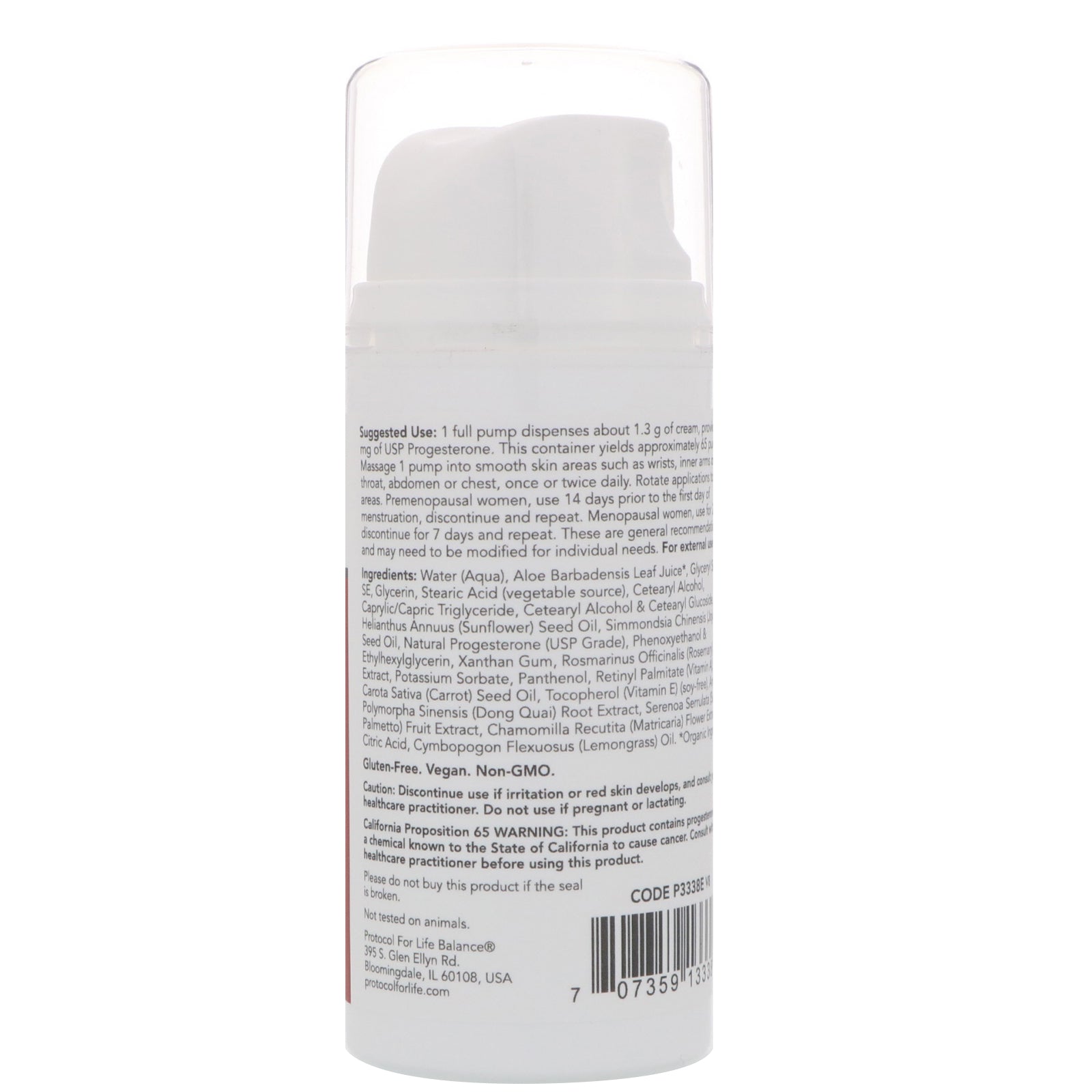 20 mg of Natural Progesterone (USP) Per Pump with Complementary Herbs No Artificial Colors, Added Fragrances or Parabens Gluten Free Vegan Non-GMO Not Tested On AnimalsSugg. Use1 full pump dispenses about 1.3 grams of cream‚ providing 20 mg of USP Progesterone. This container yields approximately 65 pumps. Massage 1 pump into smooth skin areas such as wrists, inner arms or thighs, throat, abdomen or chest, once or twice daily. Rotate applications to these areas. Premenopausal women, use 14 days prior to the first day of menstruation, discontinue and repeat. Menopausal women, use for 21 days, discontinue for 7 days and repeat. These are general recommendations only and may need to be modified for individual needs.Other IngredientsWater (aqua)‚ aloe barbadensis leaf juice*‚ glyceryl stearate se‚ glycerin‚ stearic acid (vegetable source)‚ cetearyl alcohol‚ caprylic/capric triglyceride‚ cetearyl alcohol & cetearyl glycoside‚ helianthus annuus (sunflower) seed oil‚ simmondsia chinensis (jojoba) seed oil‚ natural progesterone...