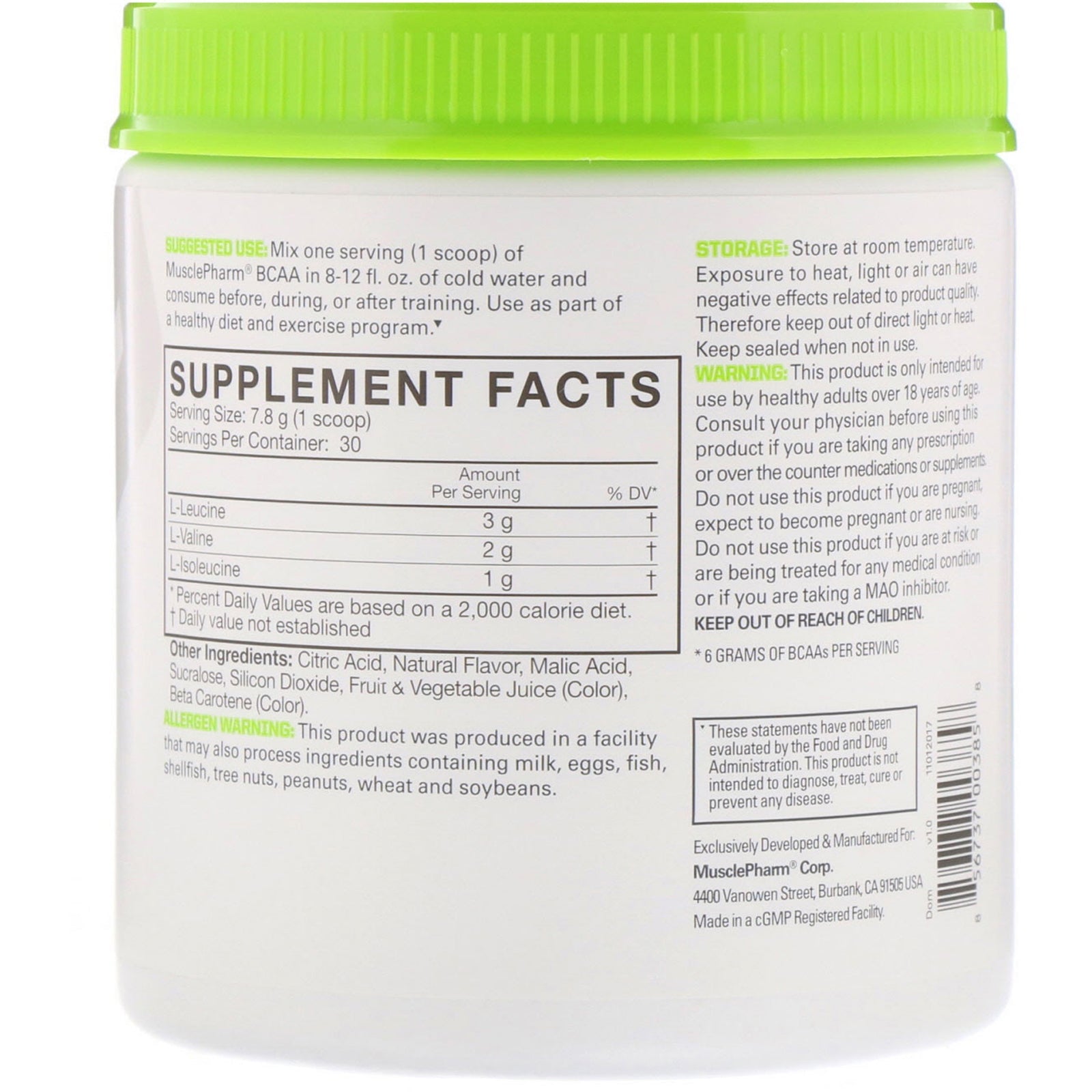 6 g* Banned Substance Tested Informed-Choice.ORG Trusted by Sport Optimized Branched-Chain Amino Acids Natural Flavors Dietary Supplement 30 Servings Made in a cGMP Registered Facility An Optimized BCAA Ready to Deliver MusclePharm BCAA delivers the ideal amount of branched-chain amino acids to support muscle development and maintenance. Our clinically-studied 3:1:2 ratio of Leucine to Isoleucine to Valine provides 6 grams of branched-chain amino acids per serving. Give your body what it's been asking for. Key Features Perfect For Before, During and After Training 6 Grams of BCAAs Supports Recovery *6 Grams of BCAAs Per ServingSugg. UseMix one serving (1 scoop) of MusclePharm BCAA in 8-12 fl.oz. of cold water and consume before, during, or after training. Use as part of a healthy diet and exercise program.Other IngredientsCitric acid, natural flavor, malic acid, sucralose, silicon dioxide, fruit & vegetable juice (color), beta carotene (color). Allergen Warning: This product was produced in...