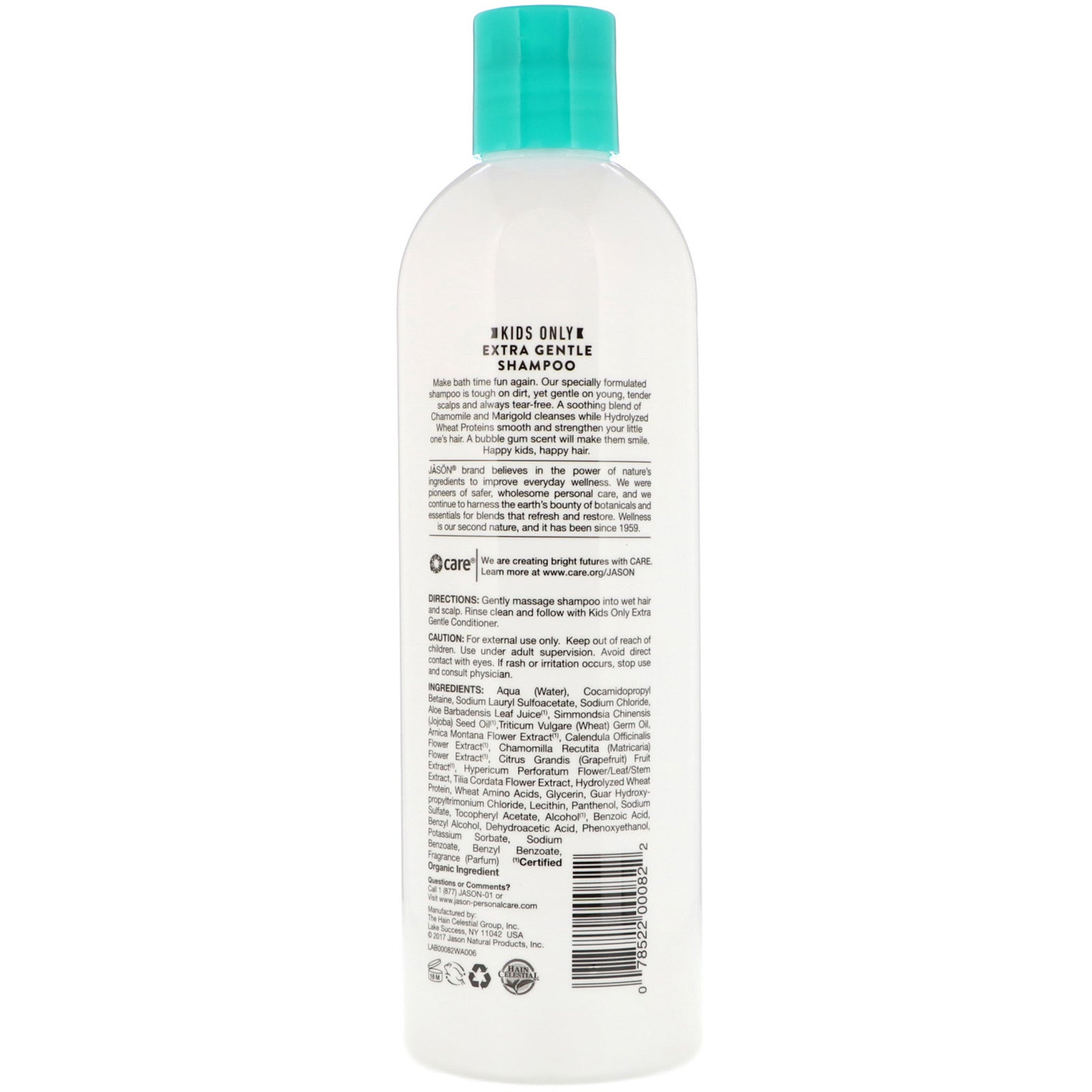 Since 1959 Tear Free No: Parabens - Phthalates - Petrolatum - Artificial Colors - Harsh Sulfates Leaping Bunny Certified Make bath time fun again. Our specially formulated shampoo is tough on dirt, yet gentle on young, tender scalps and always tear-free. A soothing blend of Chamomile and Marigold cleanses while Hydrolyzed Wheat Proteins smooth and strengthen your little one's hair. A bubble gum scent will make them smile. Happy kids, happy hair. Jason brand believes in the power of nature's ingredients to improve everyday wellness. We were pioneers of safer, wholesome personal care, and we continue to harness the earth's bounty botanicals and essentials for blends that refresh and restore. Wellness is our second nature, and it has been since 1959.Sugg. UseGently massage shampoo into wet hair and scalp. Rinse clean and follow with Kids Only Extra Gentle Conditioner.Other IngredientsAqua (water), cocamidopropyl betaine, sodium lauryl sulfoacetate, sodium chloride, aloe barbadensis...