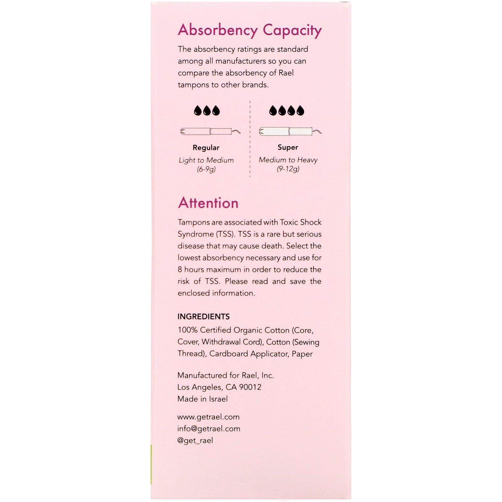 Nature Meets Nurture Chlorine-Free Fragrance-Free Cardboard Applicator with Rounded Tip Absorbency Capacity The absorbency ratings are standard among all manufacturers so you can compare the absorbency or Rael tampons to other brands. Regular - Light to M