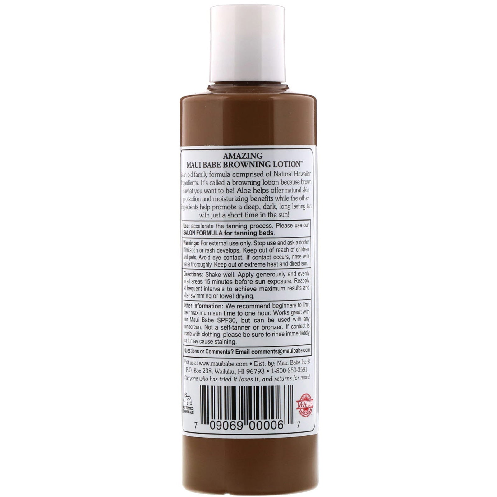 All Natural Fast Dark Tan A Local Secret Not Tested on Animals Amazing Maui Babe Browning Lotion is an old family formula comprised of Natural Hawaiian Ingredients. It's called a browning lotion because brown is what you want to be! Aloe helps offer natur