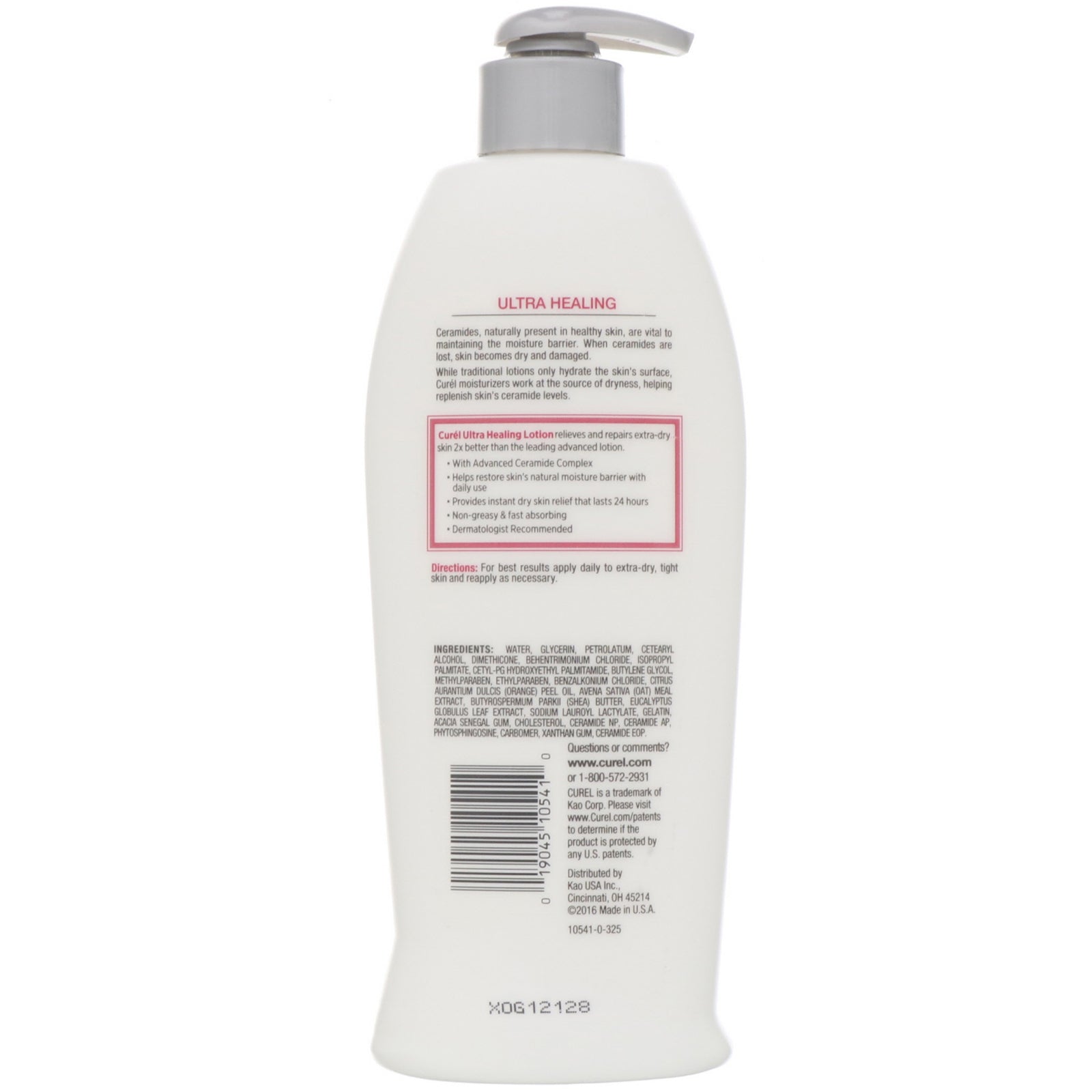 Dermatologist Tested Helps Repair Extra-Dry Skin 2x Better Helps Repair Moisture Barrier; with Advanced Ceramide Complex Helps Restore Skin's Natural Moisture Barrier with Daily Use Provides Instant Dry Skin Relief That Last 24 Hours Non-Greasy & Fast Absorbing Ultra Healing Ceramides, naturally present in healthy skin, are vital to maintaining the moisture barrier. When ceramides are lost, skin becomes dry and damaged. While traditional lotions only hydrate the skin's surface Curel moisturizes work at the source of dryness, helping replenish skin's ceramide levels. Curel Ultra Healing Lotion relieves and repairs extra-dry skin 2x better than the leading advanced lotion.Sugg. UseFor best results apply daily to extra-dry, tight skin and reapply as necessary.Other IngredientsWater, glycerin, petrolatum, cetearyl alcohol, dimethicone, behentrimonium chloride, isopropyl palmitate, cetyl-pg hydroxyethyl palmitamide, butylene glycol, methylparaben, ethylparaben, benzalkonium chloride, citrus aurantium dulcis (orange) peel oil, avena sativa (oat) meal extract, butyrospermum parkii (shea) butter, eucalyptus globulus leaf extract,...