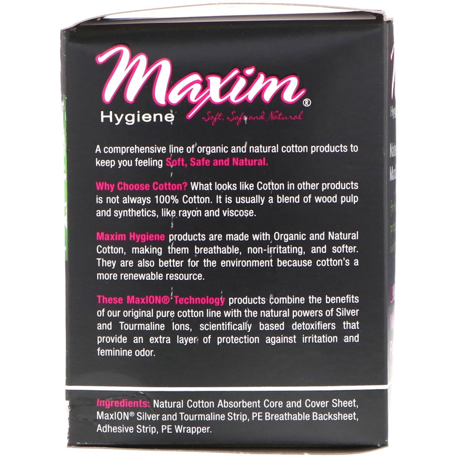 Soft, Safe and Natural For Even Better Protection Against Irritation & Odor Made with All Natural Chlorine Free Cotton to Help Prevent Irritation Unique Designs for More Comfort and Better Protection MaxION Silver & Tourmaline Strip 100% Natural C