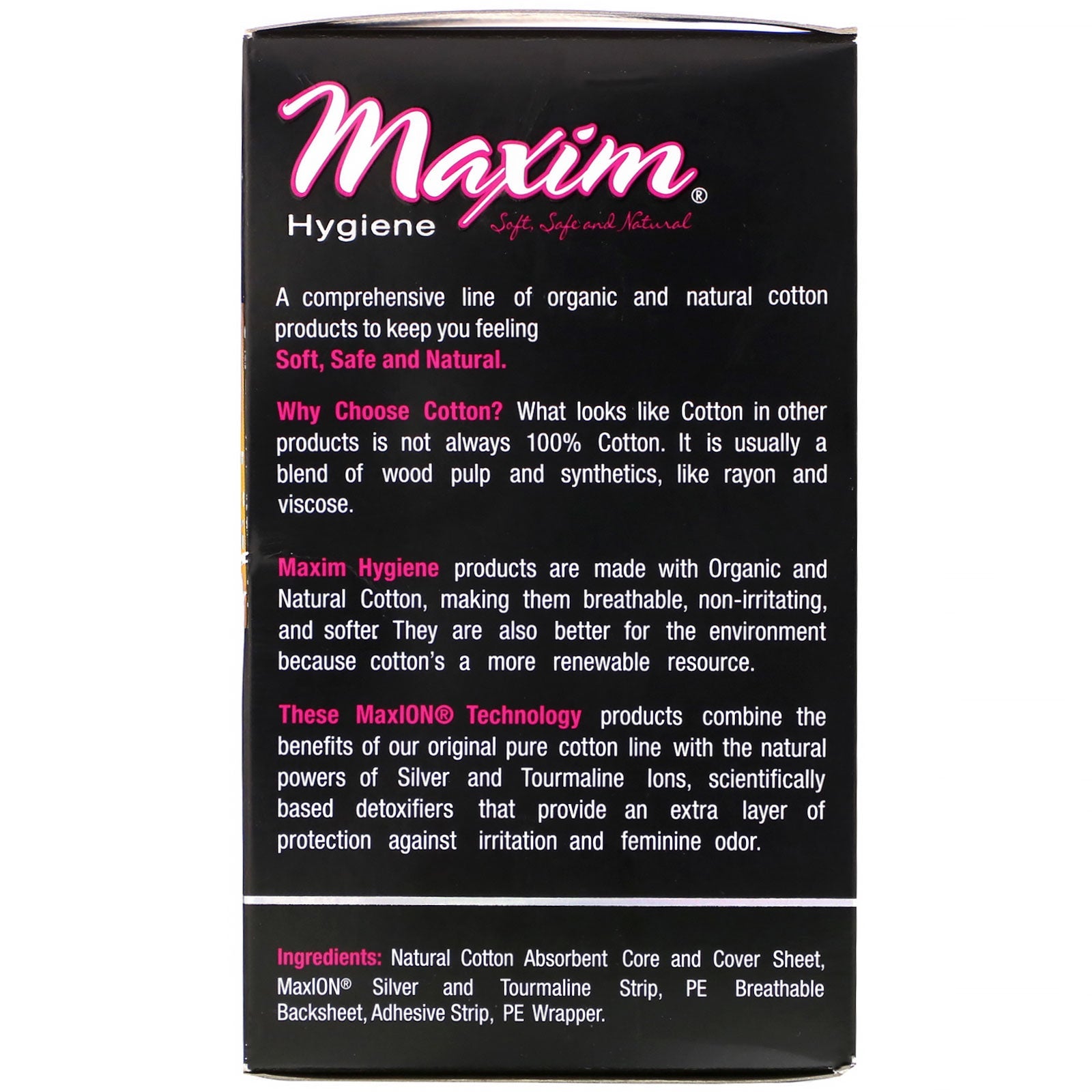 Soft, Safe and Natural For Even Better Protection Against Irritation & Odor Made with All natural Cotton - Chlorine Free to Help Prevent Irritation A comprehensive line of organic and natural cotton products to keep you feeling soft, safe and natural.