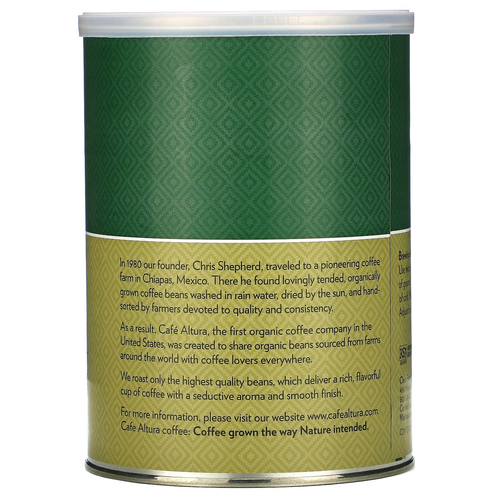 The First Coffee Co. Rain Washed, Sun Dried, Fire Roasted™ Bright, Clean & Mellow Fair Trade Certified USDA Non GMO Project Verified KSA Certified Kosher Certified by CCOF In 1980 our founder, Chris Shepherd, traveled to a pioneering coffee farm in Chiapas, Mexico. There he found lovingly tended, ally grown coffee beans washed in rain water, dried by the sun, and hand-sorted by farmers devoted to quality and consistency. As a result, Cafe Altura, the first coffee company in the United States, was created to share beans sourced from farms around the world with coffee lovers everywhere. We roast only the highest quality beans, which deliver a rich, flavorful cup of coffee with a seductive aroma and smooth finish. Cafe Altura coffee: Coffee grown the way Nature intended.Sugg. UseBrewing Instructions : Use two rounded tablespoons of ground coffee per 6 ounces of cold, filtered water. Adjust for taste. 2 Tbsp....
