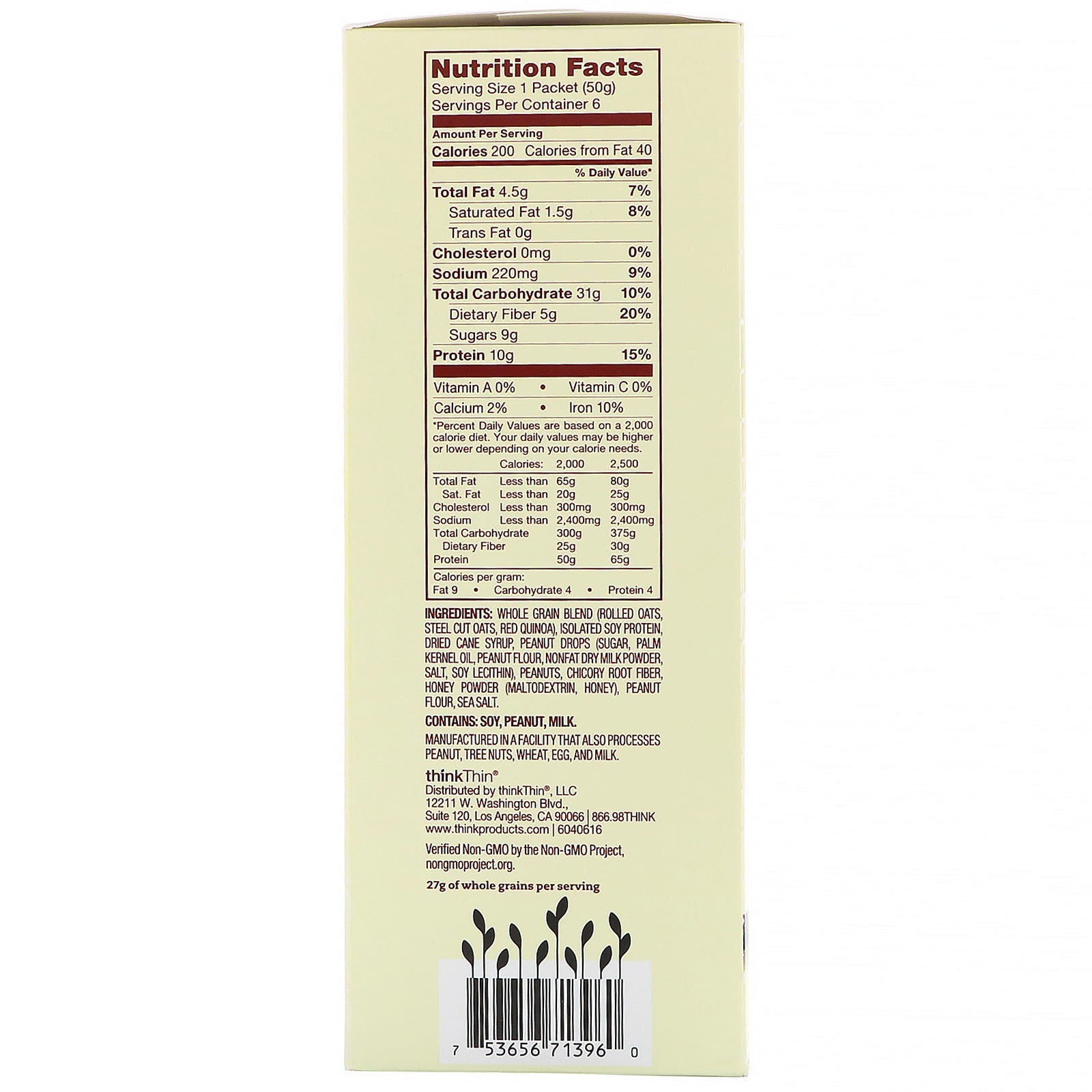ThinkThin, Protein & Fiber Hot Oatmeal, Honey Peanut Butter, 6 Packets, 1.76 oz (50 g ) Each