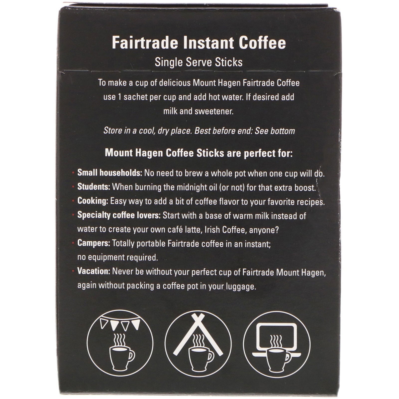 To make a cup of delicious Mount Hagen Fairtrade Coffee: Use 1 sachet per cup and add hot water. If desired add milk or sweetener.Other Ingredients