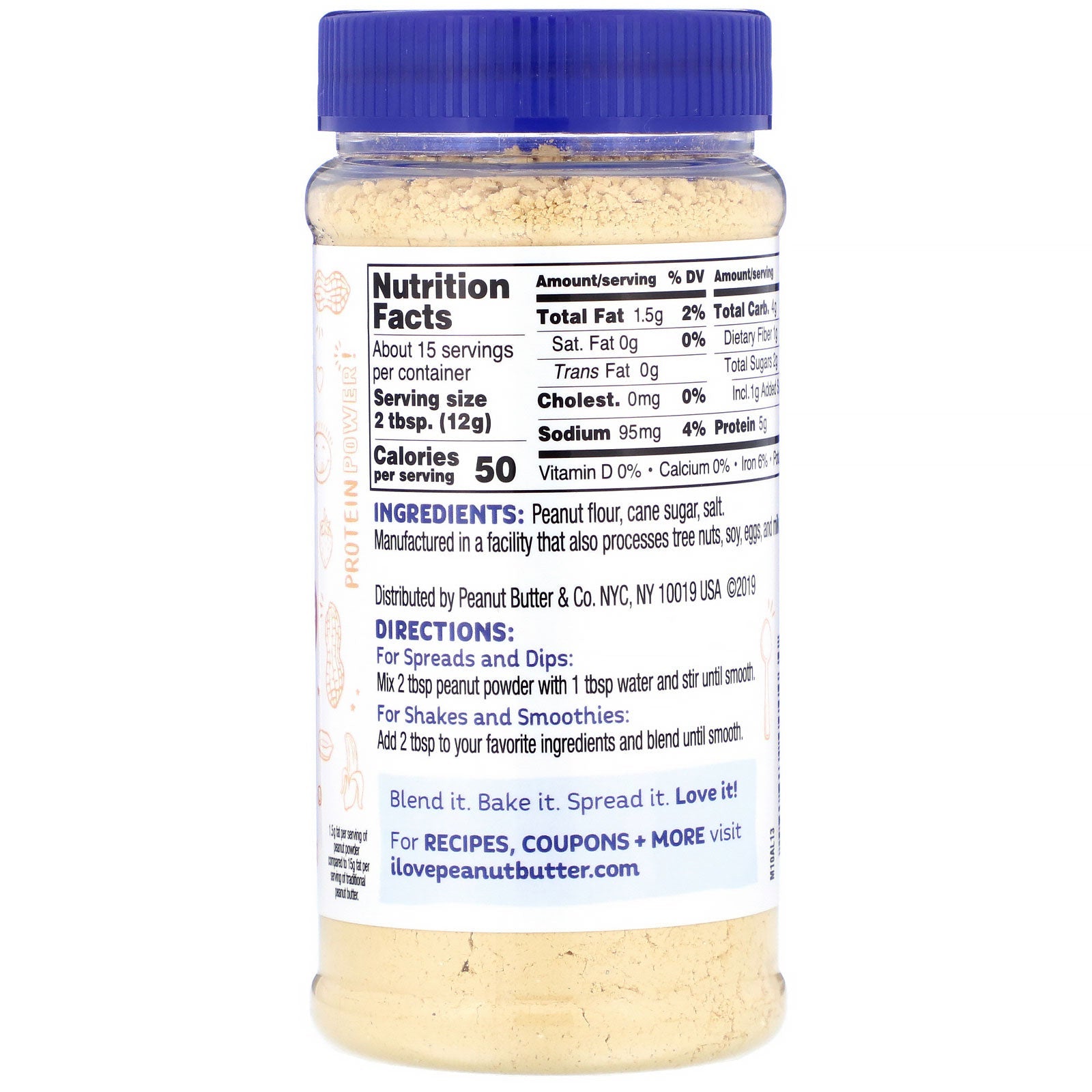 Serving Size: 2 tbsp. (12 g) Servings Per Container: About 15 Amount Per Serving %Daily Value Calories 50 Total Fat 1.5 g 2% Sat. Fat 0 g 0% Trans Fat 0 g Cholest. 0 mg 0% Sodium 95 mg 4% Total Carb. 4 g 1% Dietary Fiber 1 g 4% Total Sugars 2 g Incl. 1 g Added Sugars 2% Protein 5 g 5% Vitamin D 0% Calcium 0% Iron 6% Potassium 4% 1.5 g fat per serving of peanut powder compared to 15 g fat per serving of traditional peanut butter.