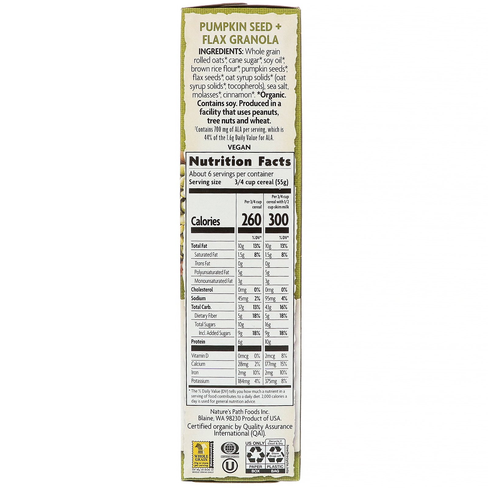 Always 5 g Fiber Per Serving 10 g Protein Per Serving with Milk‡ USDA Non GMO Project Verified Vegan Certified by Quality Assurance International (QAI) Whole Grain 31 or More Per Serving Eat 48 g or More of Whole Grains Daily Kosher Excellent Source of ALA Omega-3† Delicious Goodness ALA Omega-3 Rich Flax Seeds Protein-Packed Pumpkin Seeds Just a Touch of Cinnamon Fill your bowl with Pumpkin Seed + Flax Granola for a wholesome breakfast to nourish your day. With deliciously crunch clusters of oats, nutrient-dense pumpkin and flax seeds and a sprinkle of cinnamon and sweetness, it'll put you on a better path to a healthier lifestyle. An Legacy "Our always promise goes back to the family farm I was raised on - well before the 'industry' began. In 1985, my wife Ratana and I founded Nature's Path Foods based on my dad's advice to 'Always leave the soil better than you found it', by farming without chemical pesticides, fertilizers or GMOs. For over 30 years, our family has aspired to make delicious foods and an enduring independent company that you can love and trust". Our Promise The Certified seal on this package guarantees these ingredients have been grown in harmony with nature, reducing exposure to toxic synthetic chemicals and genetically modified seeds. It's been a promise from our family to yours for over 30 years. Non-GMO No genetic engineering has been used at any stage in growing the ingredients or in making this granola. At Nature's Path, we're committed to feeding you only , non-GMO ingredients. It's the better choice for our bodies and for the planet. ‡Prepared with 1/2 cup skim milk †Contains 700 mg of ALA per serving, which is 44% of the 1.6 g Daily Value for ALA.