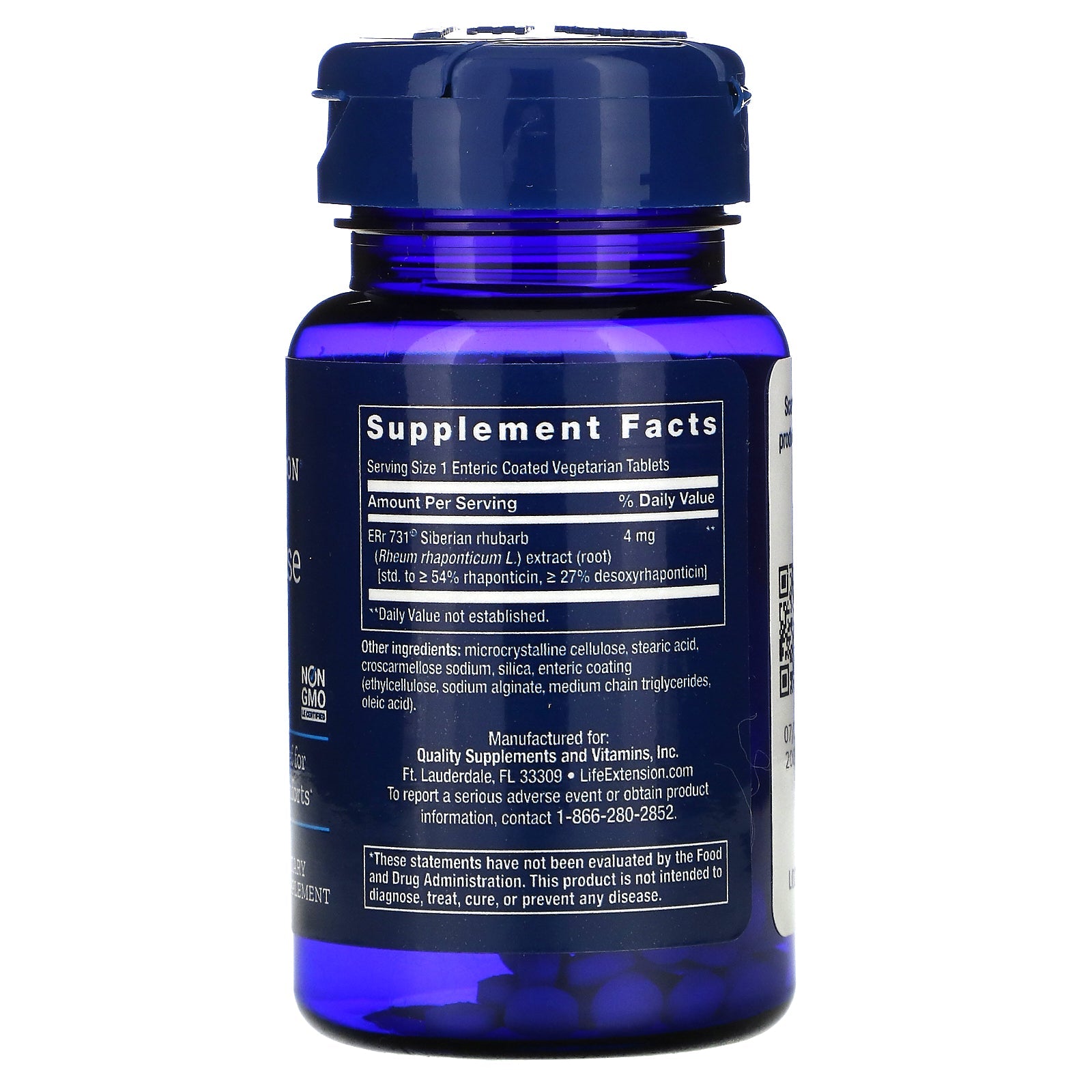 Serving Size : 1 Enteric Coated Vegetarian Tablets Amount Per Serving % Daily Value* ERr 731® Siberian rhubarb (Rheum rhaponticum L.) extract (root) [std. to ≥ 54% rhaponticin, ≥ 27% desoxyrhaponticin] 4 mg ** **Daily Value not established.