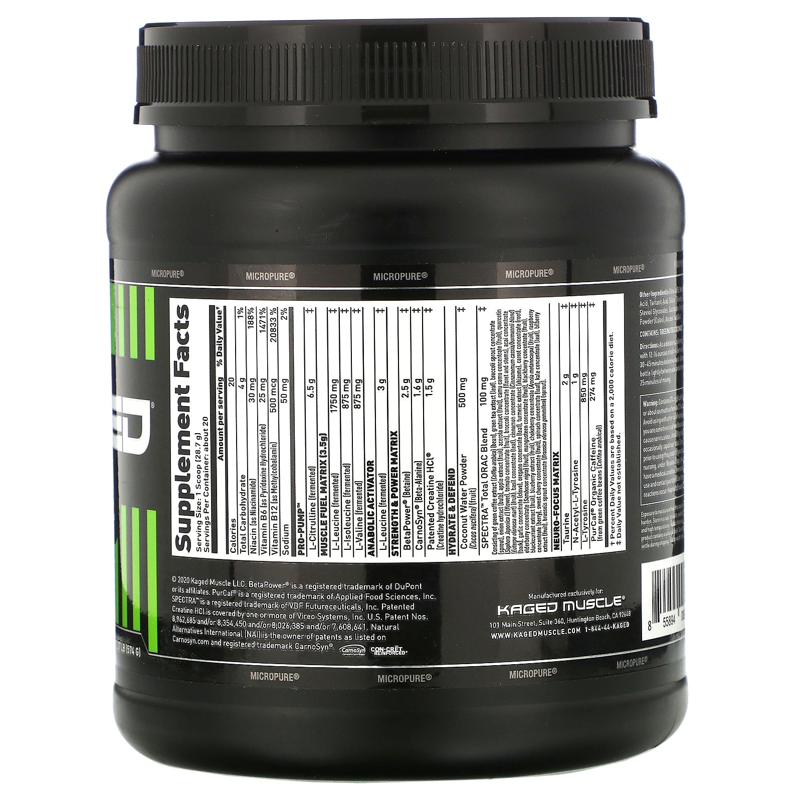 Serving Size: 1 Scoop (28.7 g) Serving Per Container: about 20 Amount Per Serving % Daily Value† Calories 20 Total Carbohydrate 4 g 1% Niacin (as Niacinamide) 30 mg 188% Vitamin B6 (as Pyridoxine Hydrochloride) 25 mg 1471% Vitamin B12 (as Methylcobalamin) 500 mcg 20833% Sodium 50 mg 2% PRO-PUMP™ L-Citrulline (fermented) 6.5 g ‡ Muscle Fuel Matrix (3.5 g) L-Leucine (fermented) 1750 mg ‡ L-Isoleucine (fermented) 875 mg ‡ L-Valine (fermented) 875 mg ‡ Anabolic Activator L-Leucine (fermented) 3 g ‡ Strength & Power Matrix BetaPower® (Betaine) 2.5 g ‡ CarnoSyn® (Beta-Alanine) 1.6 g ‡ Patented Creatine HCl® (Creatine hydrochloride) 1.5 g ‡ Hydrate & Defend Coconut Water Powder (Cocos nucifera)(fruit) 500 mg ‡ SPECTRA™ Total ORAC Blend Consisting of green coffee extract (coffea arabica)(bean), green tea extract (leaf), broccoli sprout concentrate (sprout), onion extract (bulb), apple extract (fruit), acerola extract (fruit), camu camu concentrate (fruit), quercetin (sophora japonica L.)(flower), tomato concentrate (fruit), broccoli concentrate (floret and stems), acai concentrate (euterpe oleracea mart)(fruit), basil concentrate (leaf), cinnamon concentrate (cinnamomum cassia/burmannii blend)(bark), garlic concentrate (clove), oregano concentrate (leaf), turmeric extract (rhizome), carrot concentrate (root), elderberry concentrate (sambucus nigra)(fruit), mangosteen concentrate (fruit), blackberry concentrate (fruit), blackcurrant extract (fruit), blueberry extract (fruit), chokeberry concentrate (aronia melanocarpa)(fruit), raspberry concentrate (berry), sweet cherry concentrate (fruit), spinach concentrate (leaf), kale concentrate (leaf), bilberry extract (fruit), brussel sprout concentrate (brassica oleracea gemmifera)(sprout) 100 mg † Neuro-Focus Matrix Taurine 2 g ‡ N-Acetyl-L-Tyrosine 1 g ‡ L-Tyrosine 850 mg ‡ PurCaf® Organic Caffeine (From green coffee beans[coffea arabica]) 274 mg † †Percent Daily Values are based on a 2,000 calorie diet. ‡Daily Value not established.Disclaimer