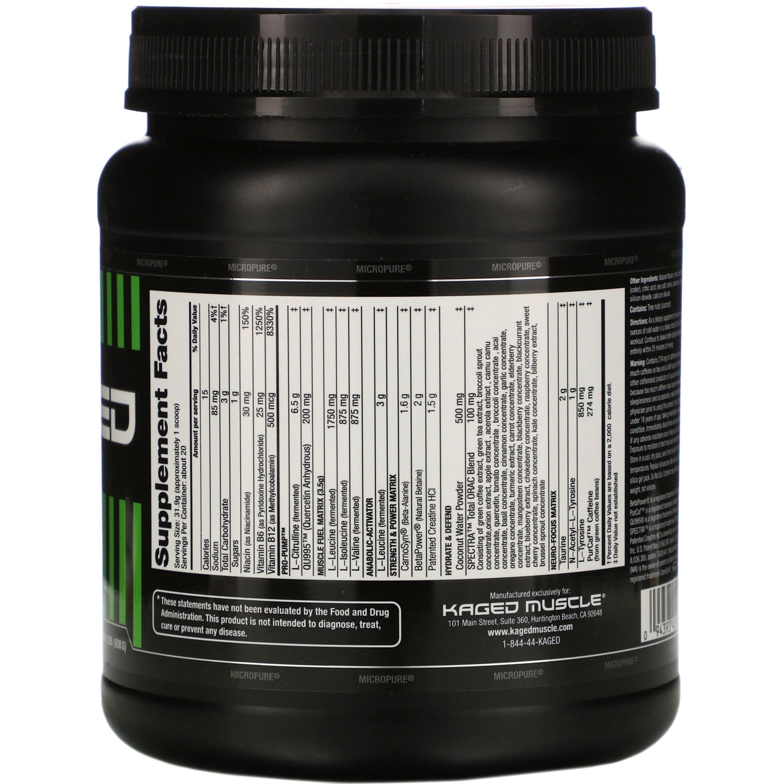 Serving Size: 31.9 g (approximately 1 scoop) Serving Per Container: 20 Amount Per Serving % Daily Value Calories 15 Sodium 85 mg 4%† Total Carbohydrate 3 g 1%† Sugars 1 g Niacin (as Niacinamide) 30 mg 150% Vitamin B6 (as Pyridoxine Hydrochloride) 25 mg 1250% Vitamin B12 (as Methylcobalamin) 500 mcg 8330% Pro-Pump™ L-Citrulline (fermented) 6.5 g ‡ QU995™ (Quercetin Anhydrous) 200 mg ‡ Muscle Fuel Matrix (3.5 g) L-Leucine (fermented) 1750 mg ‡ L-Isoleucine (fermented) 875 mg ‡ L-Valine (fermented) 875 mg ‡ Anabolic-Activator L-Leucine (fermented) 3 g ‡ Strength & Power Matrix CarnoSyn® (Beta-Alanine) 1.6 g ‡ BetaPower® (Natural Betaine) 2 g ‡ Patented Creatine HCI 1.5 g ‡ Hydrate & Defend Coconut Water Powder 500 mg ‡ Spectra Total ORAC Blend Consisting of green coffee extract, green tea extract, broccoli sprout concentrate, onion extract, apple extract, acerola extract, camu camu concentrate, quercetin, tomato concentrate, broccoli concentrate, acai concentrate, basil concentrate, cinnamon concentrate, garlic concentrate, oregano concentrate, turmeric extract, carrot concentrate, elderberry concentrate, mangosteen concentrate, blackberry concentrate, blackcurrant extract, blueberry extract, chokeberry concentrate, raspberry concentrate, sweet cherry concentrate, spinach concentrate, kale concentrate, bilberry extract, brussel sprout concentrate 100 mg ‡ Neuro-Focus Matrix Taurine 2 g ‡ N-Acetyl-L-Tyrosine 1 g ‡ L-Tyrosine PureCaf™ Caffeine (From green coffee beans) 850 mg 274 mg ‡ ‡ †Percent Daily Values are based on a 2,000 calorie diet. ‡Daily Value not established.Disclaimer