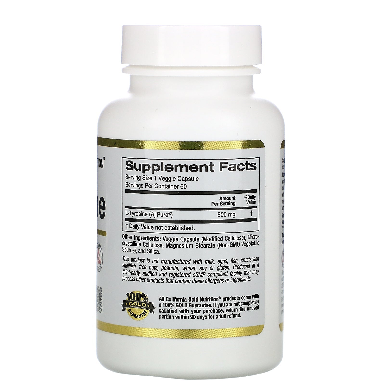 Main Ingredients L-Tyrosine Formulated with AjiPure®️ L-Tyrosine. AjiPure® is a registered trademark of AJINOMOTO® CO., INC. Other Ingredients Modified Cellulose (Veggie Capsule), Microcrystalline Cellulose, Magnesium Stearate (Non-GMO Vegetable Source), and Silicon Dioxide (Silica). This product is not manufactured with milk, eggs, fish, crustacean, shellfish, tree nuts, peanuts, wheat, soy or gluten. Produced in a third-party audited and registered cGMP compliant facility that may process other products that contain these allergens or ingredients.Supplement Facts