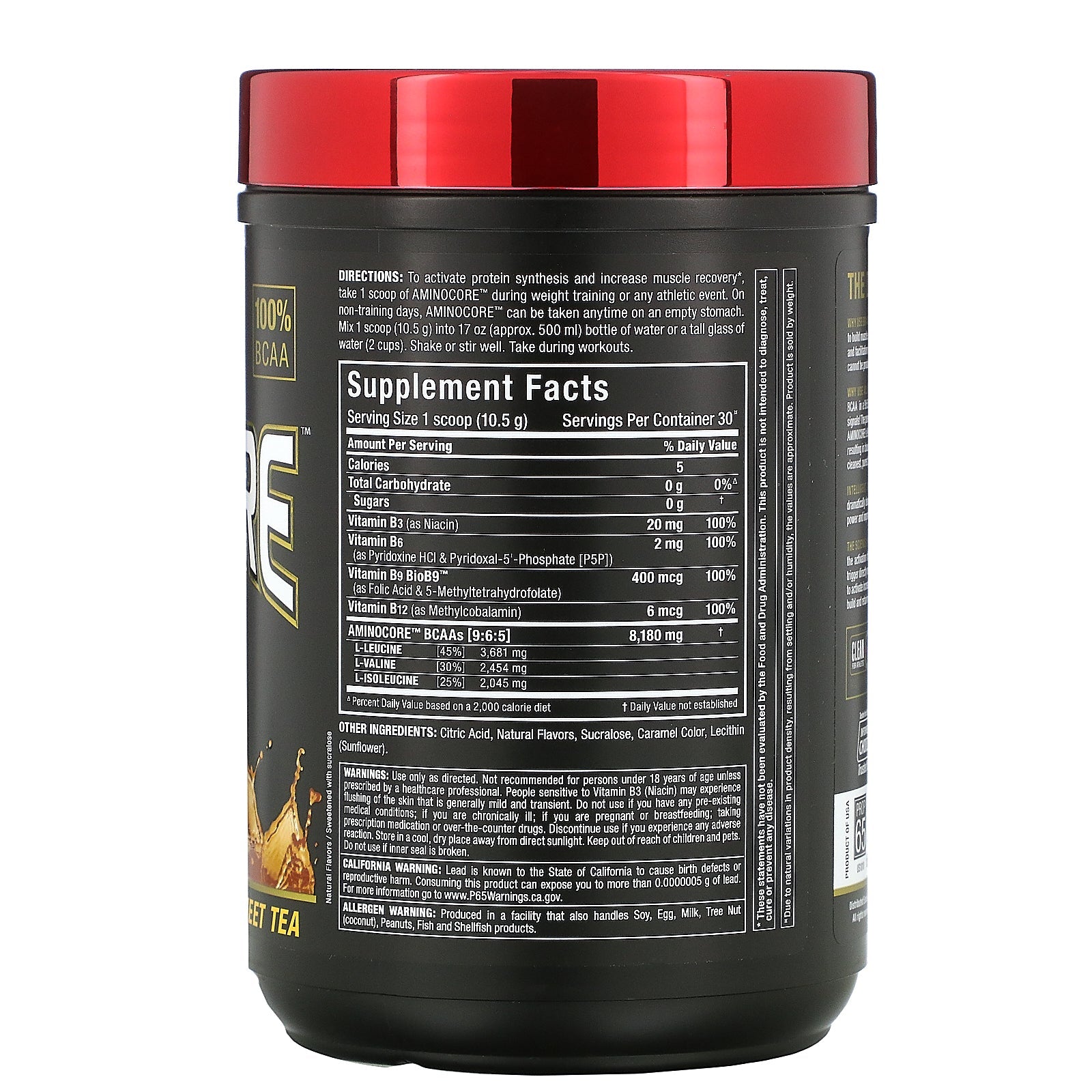 Serving Size: 1 scoop (10.5 g) Servings Per Container: 30¤ Amount Per Serving %Daily Value Calories 5 Total Carbohydrate 0 g 0%^ Sugars 0 g † Vitamin B3 (as Niacin) 20 mg 100% Vitamin B6 (as Pyridoxine HCI & Pyridoxal-5'-Phosphate [P5P]) 2 mg 100% Vitamin B9 BioB9™ (as Folic Acid & 5-Methyltetrahydrofolate) 400 mcg 100% Vitamin B12 (as Methylcobalamin) 6 mcg 100% AMINOCORE™ BCAAs [9:6:5] L-Leucine [45%] L-Valine [30%] L-Isoleucine [25%] 8,180 mg 3,681 mg 2,454 mg 2,045 mg † ^Percent Daily Value based on a 2,000 calorie diet †Daily Value not established ¤Due to natural variations in product density, resulting from settling and/or humidity, the values are approximate.Disclaimer