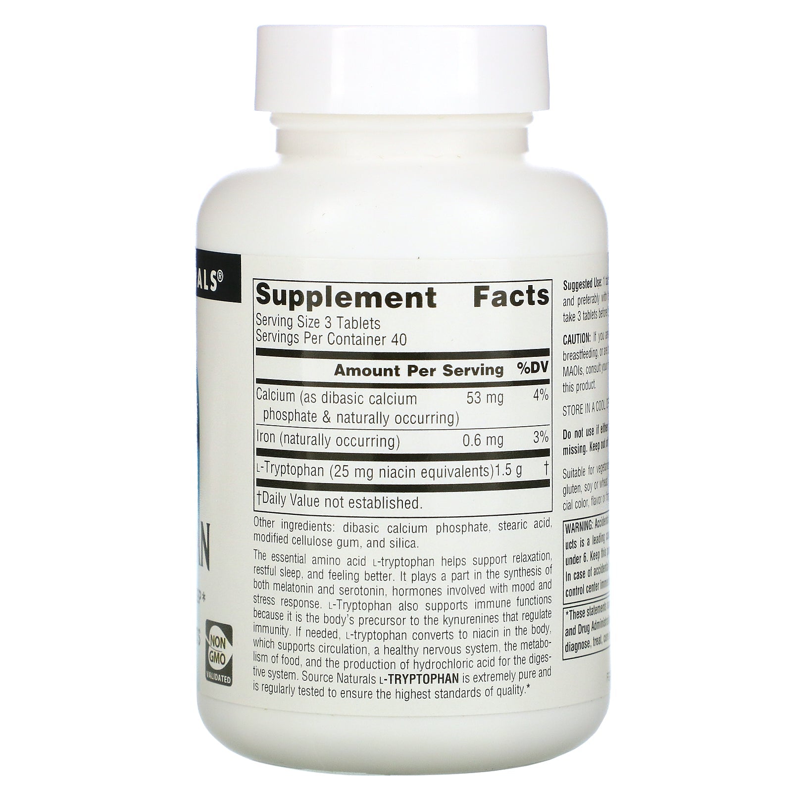 Dietary Supplement Mood, Relaxation, Sleep Non-GMO Validated Suitable for Vegetarians The essential amino acid L-tryptophan helps support relaxation, restful sleep, and feeling better. It plays a part in the synthesis of both melatonin and serotonin, hormones involved with mood and stress response. L-Tryptophan also supports immune functions because it is the body's precursor to the kynurenines that regulate immunity. If needed, L-tryptophan converts to niacin in the body, which supports circulation, a healthy nervous system, the metabolism of food, and the production of hydrochloric acid for the digestive system. Source Naturals L-Tryptophan is extremely pure and is regularly tested to ensure the highest standards of quality.Sugg. Use1 tablet three times daily, between meals and preferably with fruit juice. To support restful sleep, take 3 tablets before bed.Other IngredientsDibasic calcium phosphate, stearic acid, modified cellulose gum, and silica. Contains no yeast, dairy, egg, gluten, soy or wheat. Contains no preservatives, or...