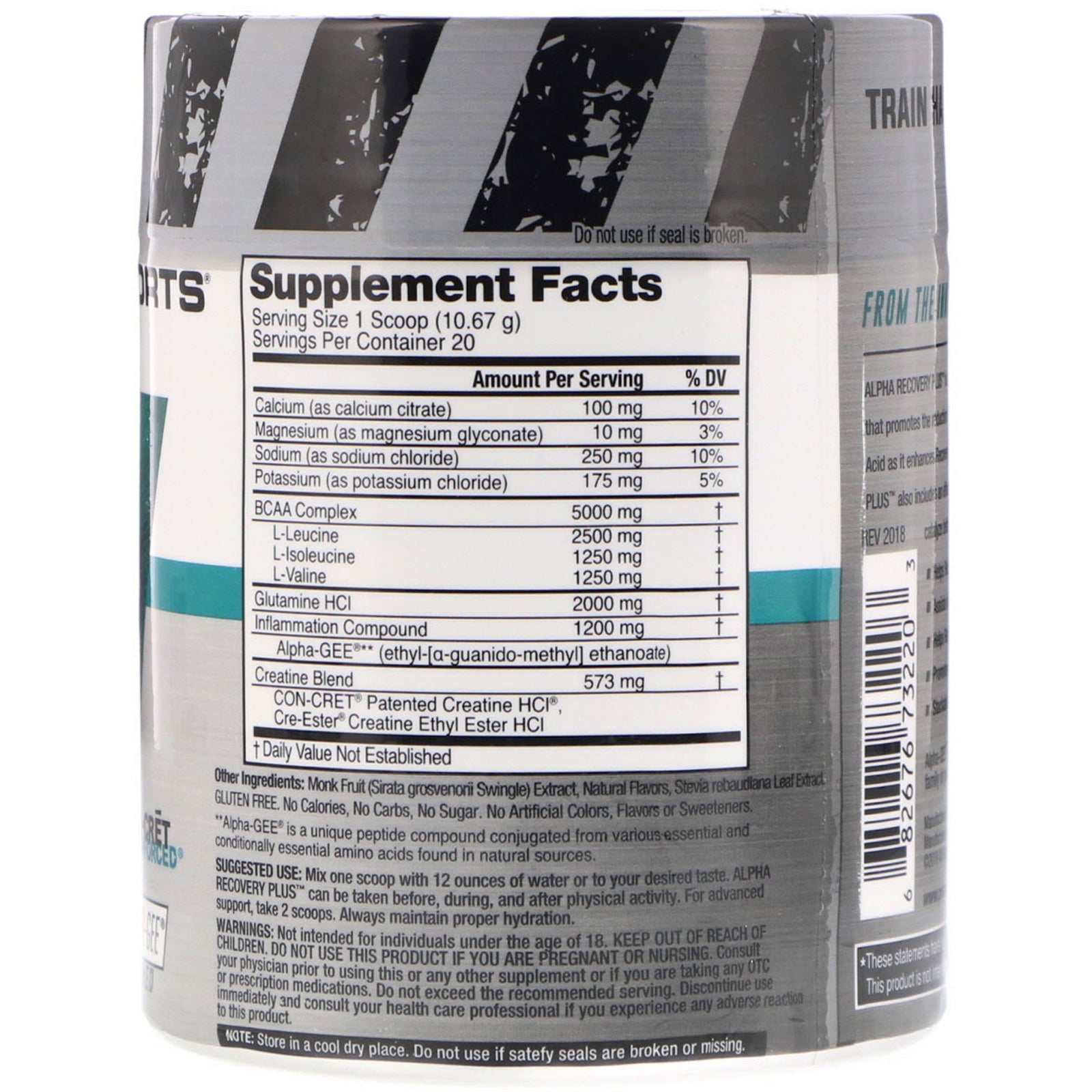 20 Servings Train Harder. Recover Faster. With Exercise Inflammation Relief Con-Cret Reinforced Alpha-Gee Enriched Glutamine HCI BCAAs Electrolytes Naturally Flavored & Sweetened Dietary Supplement From the Innovators of Con-Cret Alpha Recovery Plus is a dramatic advancement in sports supplementation that promotes the reduction of Exercise-Induced Inflammation (EII) and Lactic Acid as it enhances Recovery, Hydration, and Performance. Alpha Recovery Plus also includes an effective creatine blend of Con-Cret® and Cre-Ester® to catalyze better ATP regeneration. Helps reduce exercised induced inflammation and soreness Assists in reducing lactic acid Helps restore electrolytes Promotes muscle and joint health Stackable with Con-Cret Alpha-Gee and Con-Cret are part of a patent protected family of products.