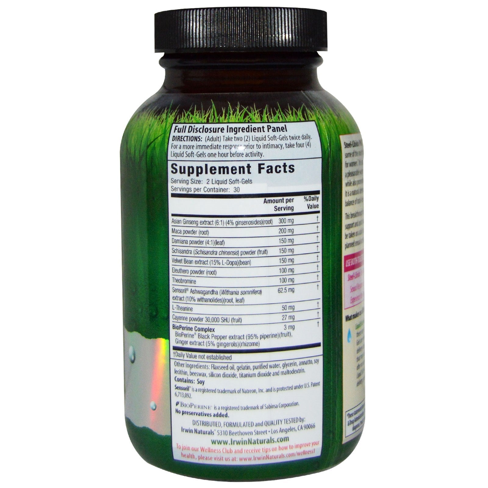 Serving Size: 2 Liquid Soft-Gels Serving Per Container: 30 Amount Per Serving %Daily Value* Asian Ginseng extract (6:1) (4% ginsenosides)(root) 300 mg † Maca powder (root) 200 mg † Damiana powder (4:1)(leaf) 150 mg † Schisandra (Schisandra chinensis) powder (fruit) 150 mg † Velvet Bean extract (15% L-Dopa)(bean) 150 mg † Eleuthero powder (root) 100 mg † Theobromine 100 mg † Sensoril Ashwagandha (Withania somnifera) extract (10% withanolides)(root, leaf) 62.5 mg † L-Theanine 50 mg † Cayenne powder 30,000 SHU (fruit) 27 mg † BioPerine Complex BioPerine Black Pepper extract (95% piperine)(fruit), Ginger extract (5% gingerols)(rhizome) 3 mg † † Daily Value not established.