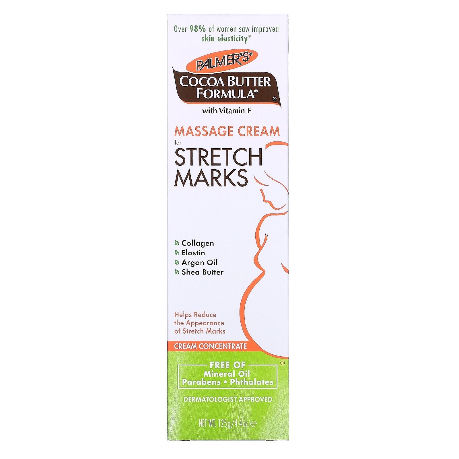 Over 98% of Women Saw Improved Skin Elasticity* With Vitamin E Collagen Elastin Argan Oil Shea Butter Helps Reduce the Appearance of Stretch Marks Cream Concentrate Free of Mineral Oil - Parabens - Phthalates Dermatologist Approved Made With Natural Vitamin E (Tocopherol) Palmers is Against Animal Testing Family Owned & Operated Hypoallergenic Suitable for Sensitive Skin Palmer's Massage Cream helps improve skin elasticity and reduce the appearance of stretch marks. Pure cocoa butter and shea butter, natural oils, collagen, elastin and lutein keep skin moisturized and supple for 48 hours allowing skin to stretch more easily. Widely recommended for stretch marks during and after pregnancy or weight fluctuation. This cream concentrate formula is ideal for stretch mark prone areas such as tummy, hips, thighs and bust. *Based on an 8 week in-home trial by 102 female panelists aged 18 to 49