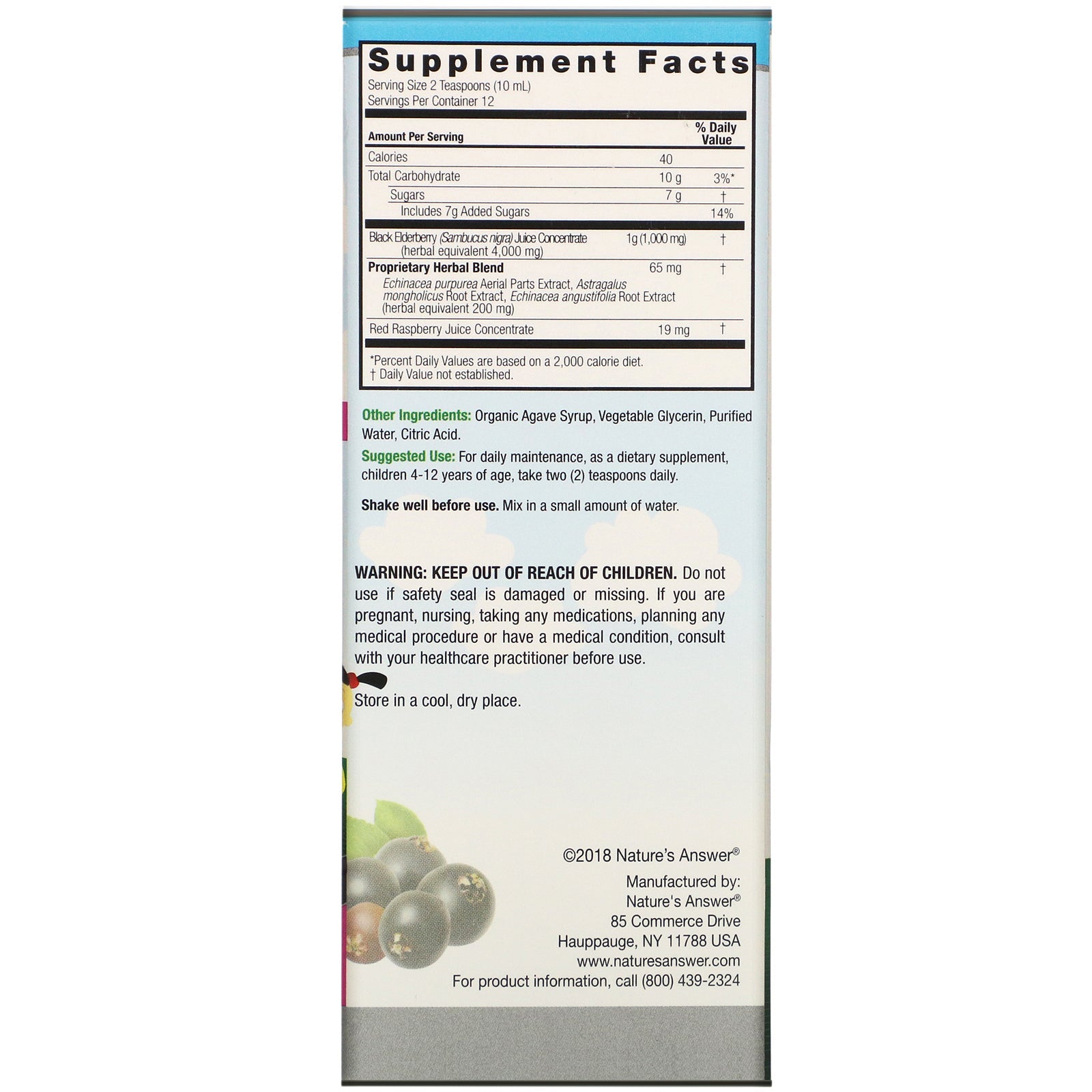 Serving Size: 2 Teaspoons (10 mL) Servings Per Container: 12 Amount Per Serving %Daily Value Calories 40 Total Carbohydrate 10 g 3%* Sugars 7 g † Includes 7 g Added Sugars 14% Black Elderberry (Sambucus nigra) Juice Concentrate (herbal equivalent 4,000 mg) 1 g (1,000 mg) † Proprietary Herbal Blend Echinacea purpurea Aerial Parts Extract, Astragalus mongholicus Root Extract, Echinacea angustifolia Root Extract (herbal equivalent 200 mg) 65 mg Red Raspberry Juice Concentrated 19 mg † *Percent Daily Values are based on a 2,000 calorie diet. †Daily Value not established.Disclaimer