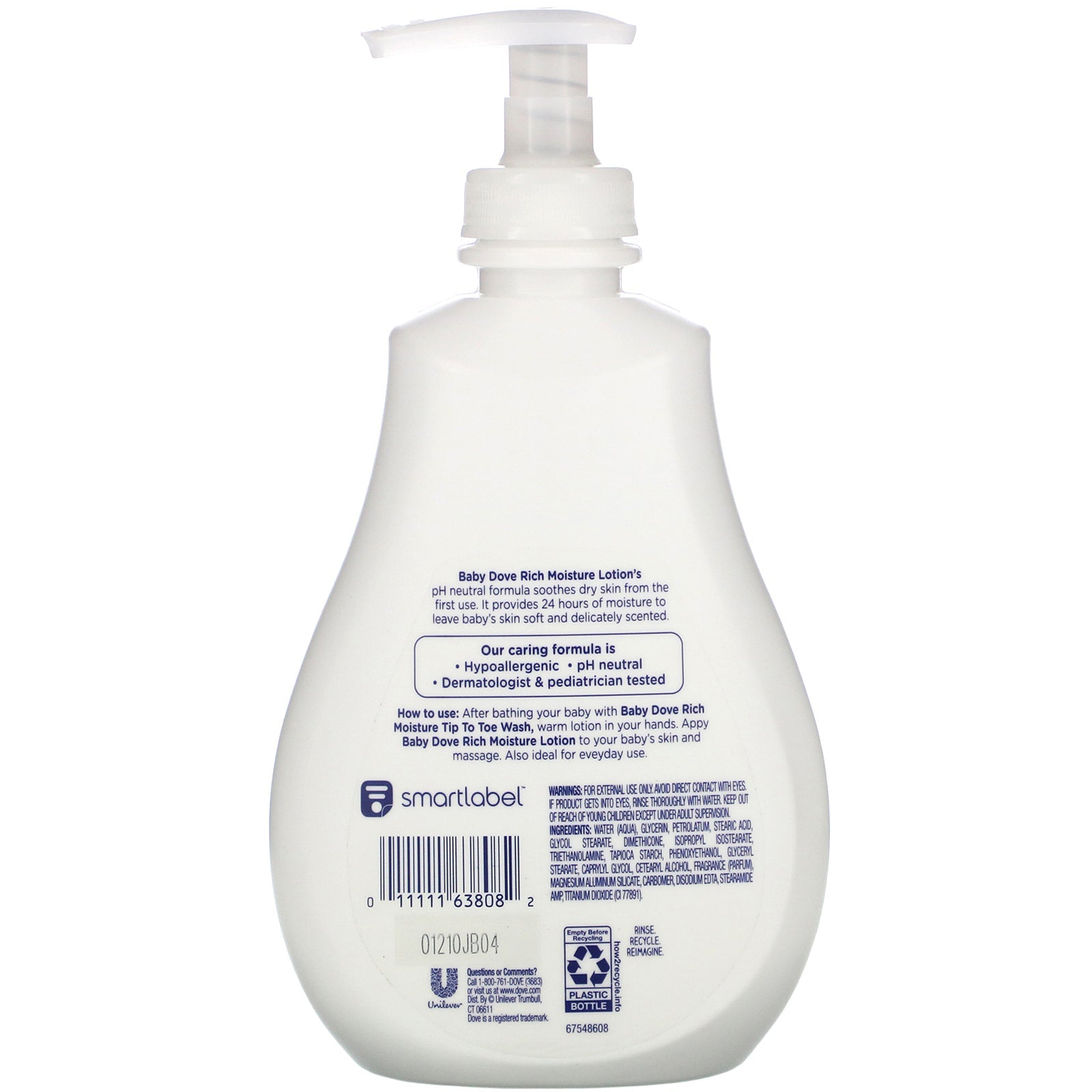 Now with Pump Hypoallergenic - pH Neutral Gently Moisturizes Baby Skin for 24 Hours Created with No Dyes No Parabens No Phthalates Baby Dove Rich Moisture Lotion's pH neutral formula soothes dry skin from the first use. It provides 24 hours of moisture to leave baby's skin soft and delicately scented. Our caring formula is: Hypoallergenic pH Neutral Dermatologist & Pediatrician TestedSugg. UseAfter bathing your baby with Baby Dove Rich Moisture Tip to Toe Wash, warm lotion in your hands. Apply Baby Dove Rich Moisture Lotion to your baby's skin and massage. Also ideal for everyday use.Other IngredientsWater, glycerin, petrolatum, stearic acid, glycol stearate, dimethicone, isopropyl isostearate, triethanolamine, tapioca starch, phenoxyethanol, glyceryl stearate, caprylyl glycol, cetearyl alcohol, fragrance, magnesium aluminum silicate, carbomer, disodium edta , stearamide amp, titanium dioxide (ci 77891).Supplement FactsDisclaimerWhile VitaminsUK strives to ensure the accuracy of its product images and information, some manufacturing changes to packaging and/or...