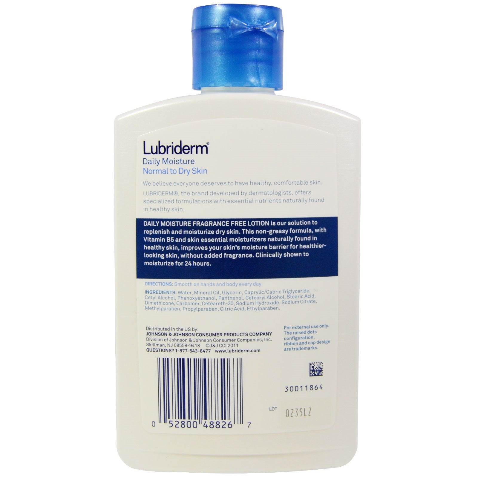 Dermatologist Developed Enriched with Vitamin B5 and Skin Essential Moisturizers Clinically Shown to Moisturize for 24 Hours Clean, Non-Greasy Feel We believe everyone deserves to have healthy, comfortable skin. Daily Moisture Fragrance Free Lotion is our solution to replenish and moisturize dry skin. This non-greasy formula, with Vitamin B5 and skin essential moisturizers naturally found in healthy skin, improves your skin's moisture barrier for healthier-looking skin, without added fragrance. Clinically shown to moisturize for 24 hours.Sugg. UseSmooth on hands and body every day.Other IngredientsWater, mineral oil, glycerin, caprylic/capric, triglyceride, cetyl alcohol, phenoxyethanol, panthenol, cetearyl alcohol, stearic acid, dimethicone, carbomer, ceteareth-20, sodium hydroxide, sodium citrate, methylparaben, propylparaben, citric acid, ethylparaben.Supplement FactsDisclaimerWhile VitaminsUK strives to ensure the accuracy of its product images and information, some manufacturing changes to packaging and/or ingredients may be pending update on our site. Although items may occasionally ship with alternate packaging, freshness is always guaranteed. We recommend...