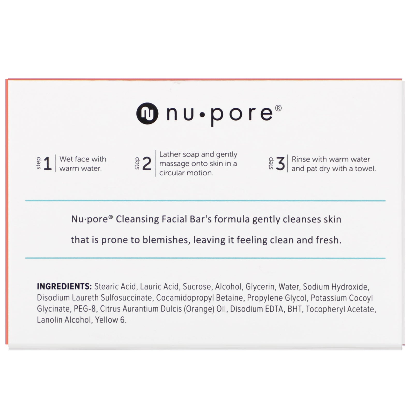 Gently Cleanses Freshens Skin Nu-Pore® Cleansing Facial Bar's formula gently cleanses skin that is prone to blemishes, leaving it feeling clean and fresh.Sugg. UseWet face with warm water. Lather soap and gently massage onto skin in a circular m