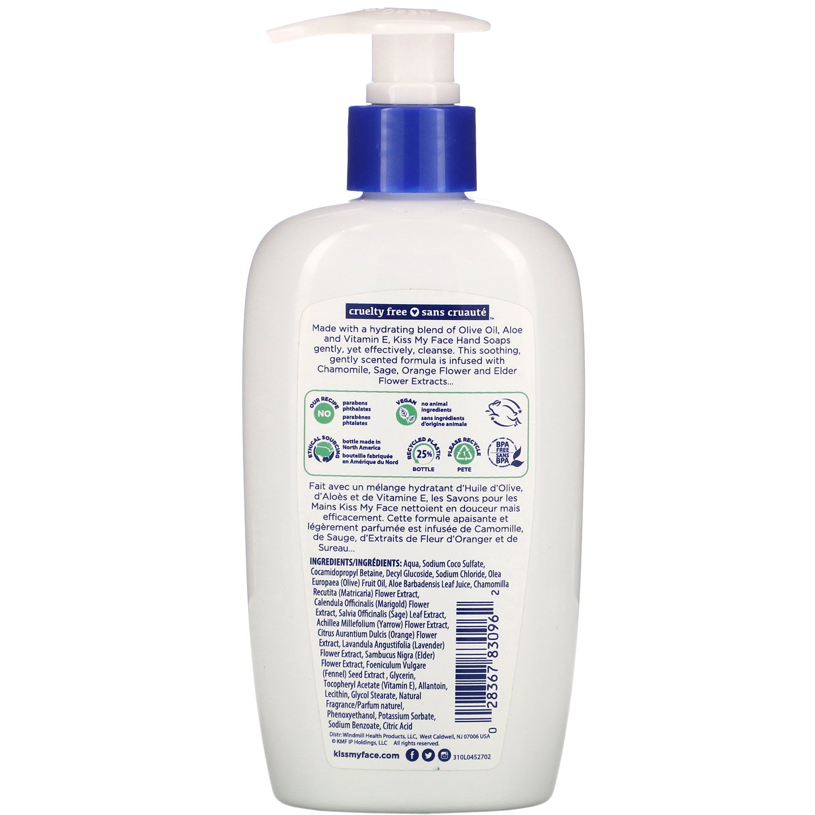 Cleanses & Soothes With Hydrating Botanical Blends ™ Vegan Cruelty Free Our Recipe: No Parabens/Phthalates Vegan - No Animal Ingredients Ethical Sourcing BPA Free Made with a hydrating blend of Olive Oil, Aloe and Vitamin E, Kiss My Face Hand Soaps