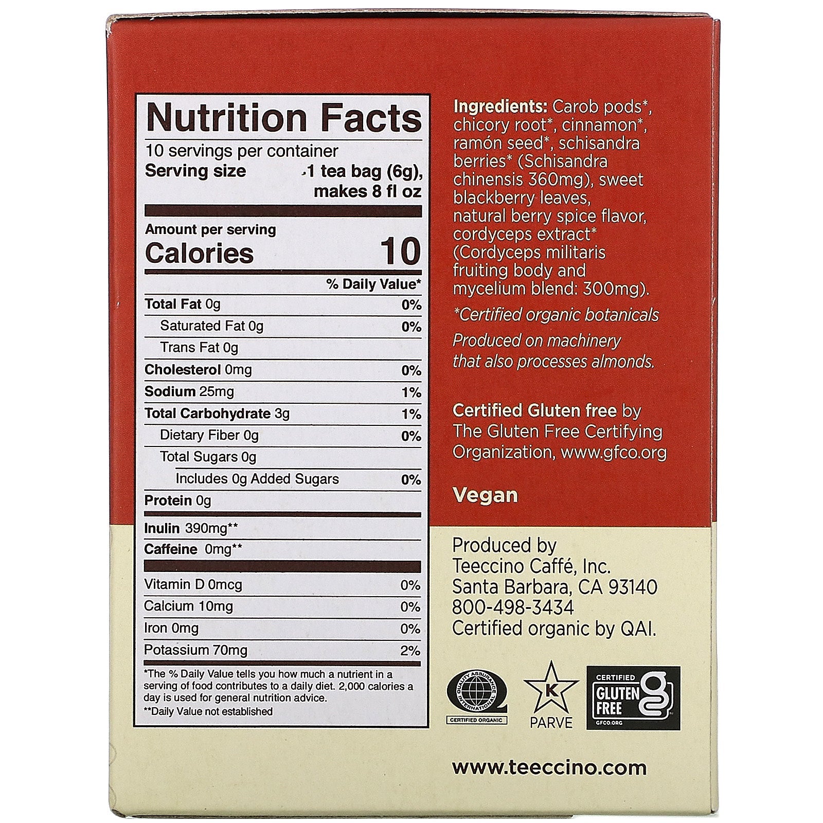 Teeccino, Mushroom Herbal Tea, Cordyceps Schisandra, Caffeine Free, 10 Tea Bags, 2.12 oz (60 g)