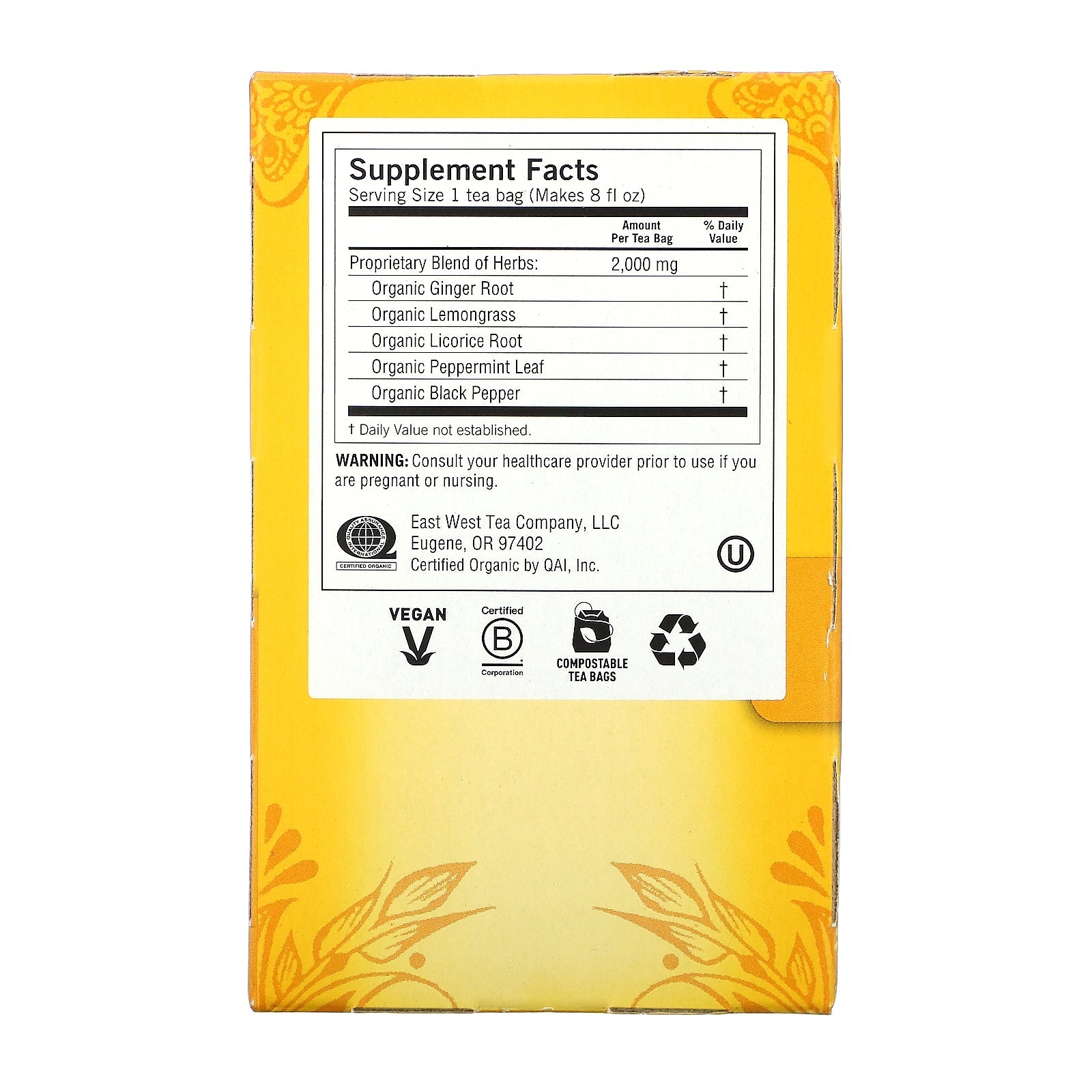 Supports Healthy Digestion Caffeine Free Herbal Supplement Non-GMO Project Verified USDA Certified by QAI, Inc. Kosher Vegan Certified B Corporation Compostable Tea Bags Savor the Tradition of Ginger In Ayurveda, naturally warming Ginger has been tradit