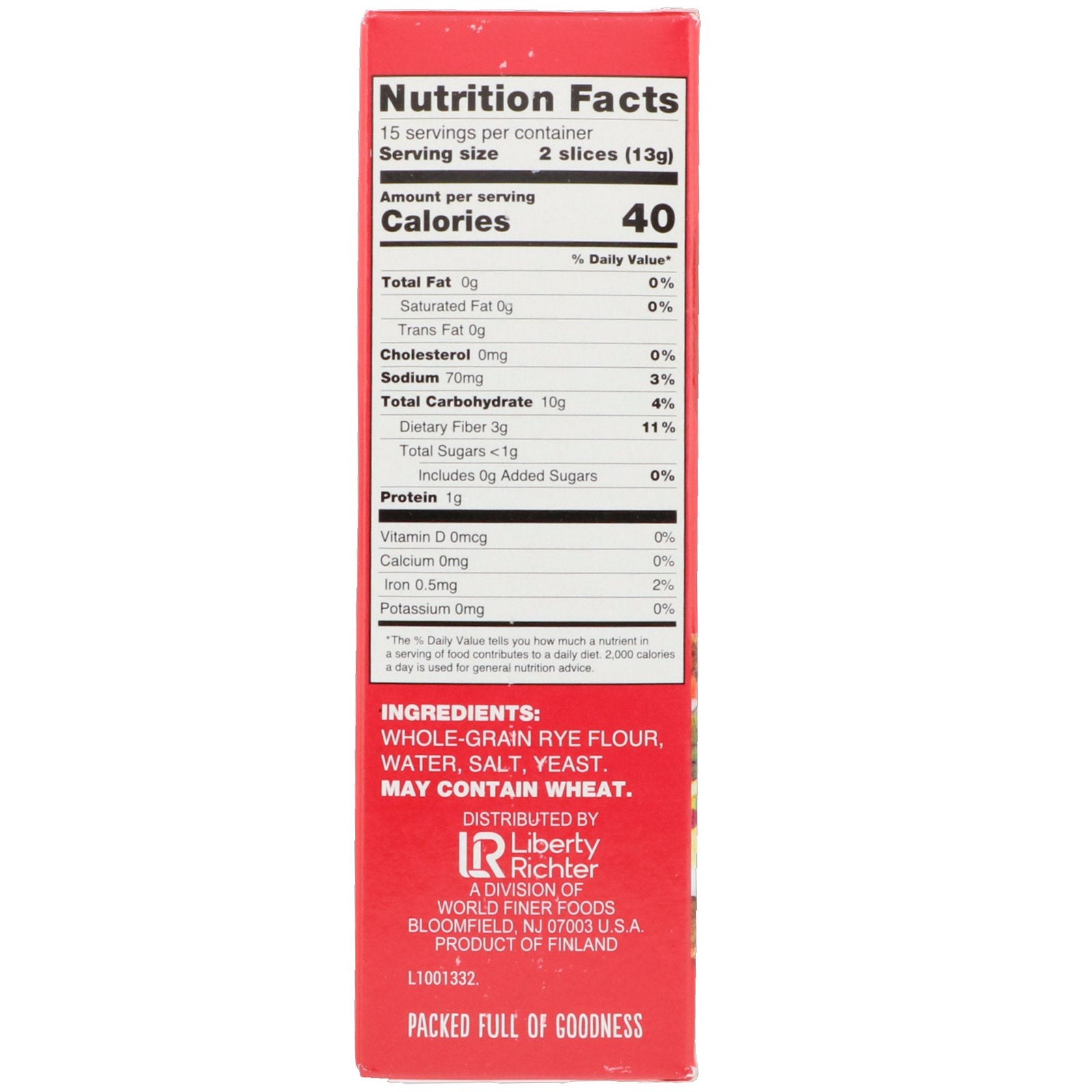 Original Finnish Recipe 100% Whole Grain* Good Source of Fiber Non-GMO Project Verified Whole Grain-10 g or More Per Serving Eat 48 g or More of Whole Grains Daily Kosher Parve Finland Packed Full of Goodness 30 Slices / Pack *Finn Crisp contains 100% who