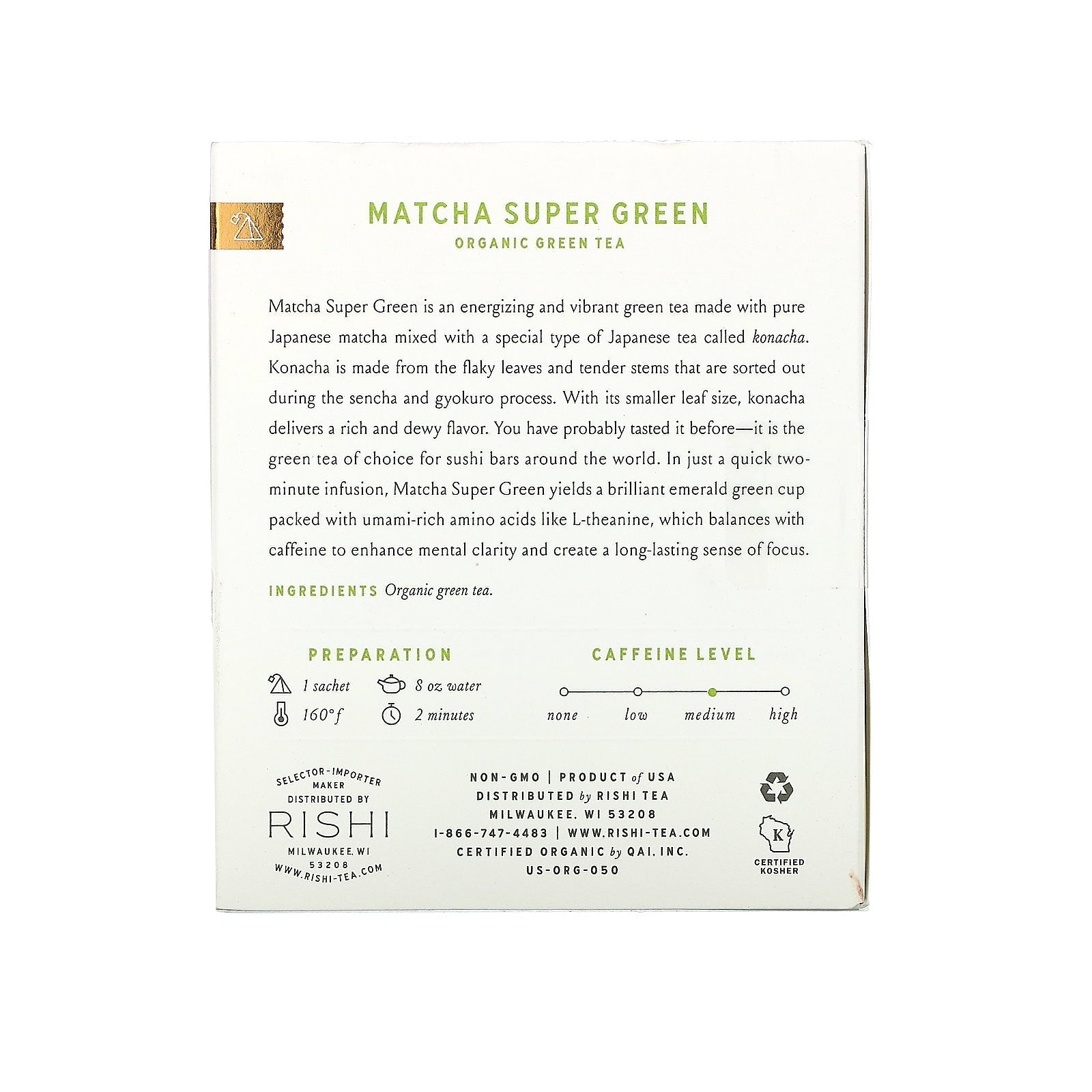 Tea & Botanicals USDA Caffeine Level: Medium Non-GMO Certified by QAI.Inc. Certified Kosher Matcha Super Green is an energizing and vibrant green tea made with pure Japanese matcha mixed with a special type of Japanese tea called konacha. Konacha is