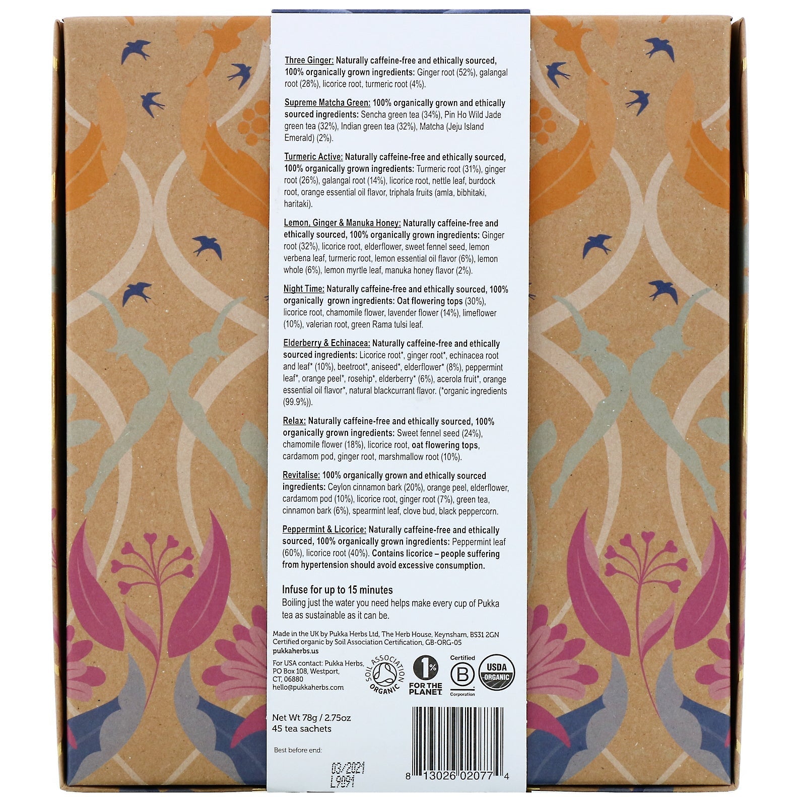 45 Sachets of Nine Incredible Herbal Tea Selected From the Pukka Range Certified by Soil Association Certification Certified B Corporation USDA Tea Selection Box Contains: Three Ginger: Naturally caffeine-free and ethically sourced, 100% ally grown