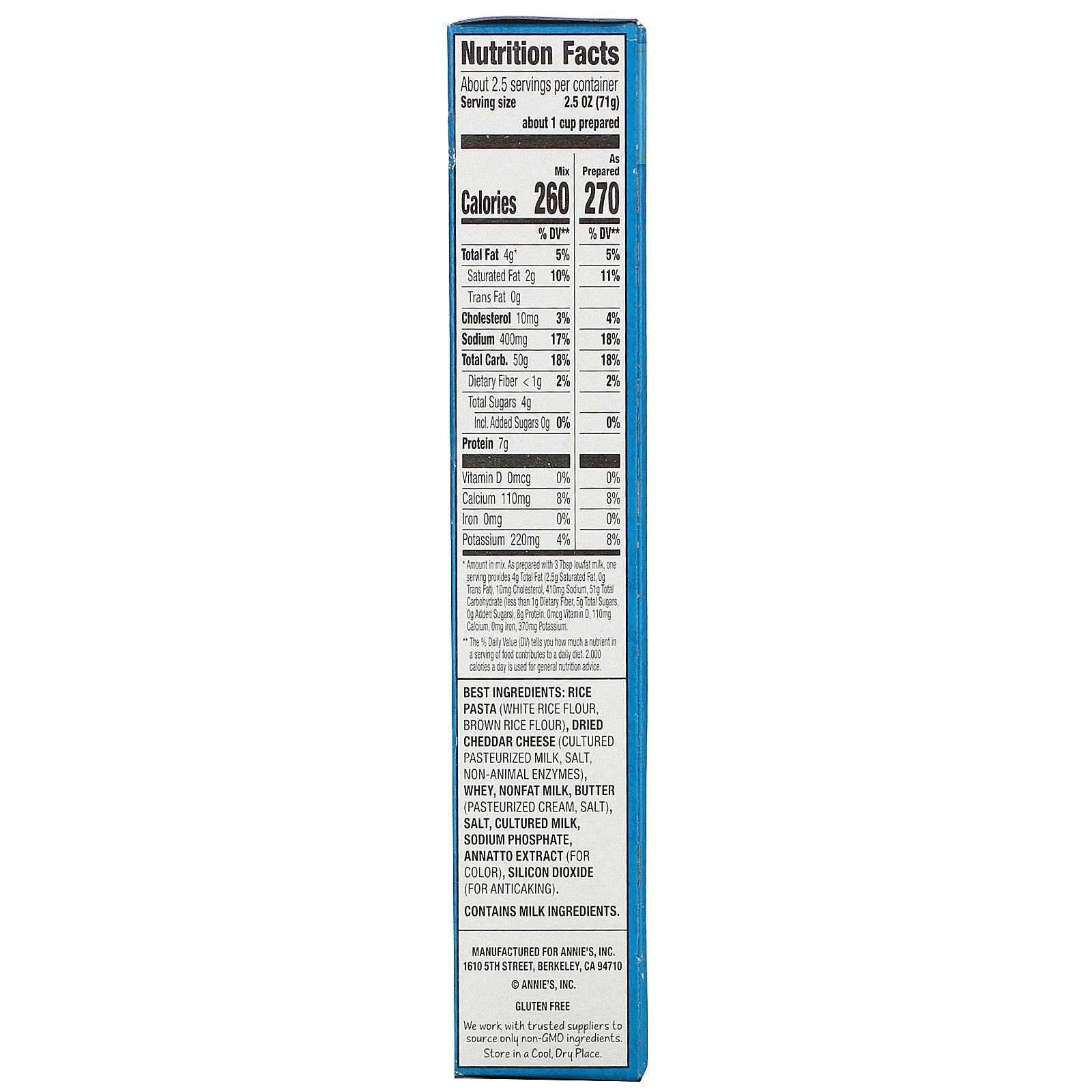 Gluten Free Made with Real Cheese Certified Gluten-Free by NSF Made with Goodness! No Artificial Flavors, Synthetic Colors or Preservatives Cheese From Cows Not Treated with rBST* *No significant difference has been shown between milk derived from rBST-treated and non rBST-treated cows.Sugg. UseOther IngredientsRice pasta (white rice flour, brown rice flour), dried cheddar cheese (cultured pasteurized milk, salt, non-animal enzymes), whey, nonfat milk, butter (pasteurized cream, salt), salt, cultured milk, sodium phosphate, annatto extract (for color), silicon dioxide (for anticaking). Contains milk ingredients.Supplement FactsServing Size: 2.5 oz (71 g) Servings Per Container: About 2.5 / About 1 cup prepared Amount Per Serving Mix As Prepared Calories 260 270DisclaimerWhile VitaminsUK strives to ensure the accuracy of its product images and information, some manufacturing changes to packaging and/or ingredients may be pending update on our site. Although items may occasionally ship with alternate packaging, freshness is always guaranteed. We recommend that you...