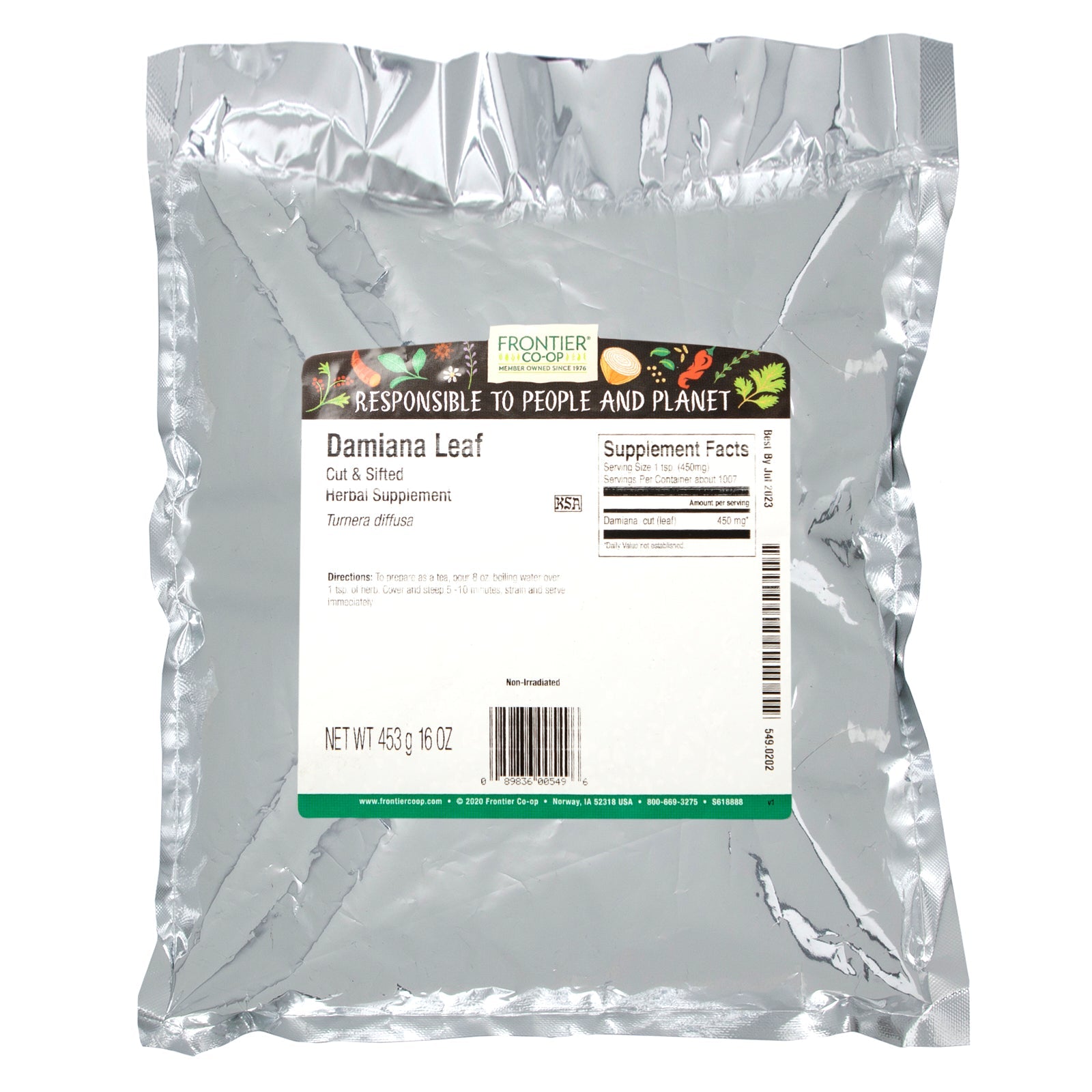 Member Owned Since 1976 Responsible to People and Planet Herbal Supplement Kosher Non-Irradiated Frontier Co-op Bulk Cut & Sifted Damiana Leaf is sourced from its naive Mexico. The flowering shrub with aromatic leaves is native to Mexico, Central Amer