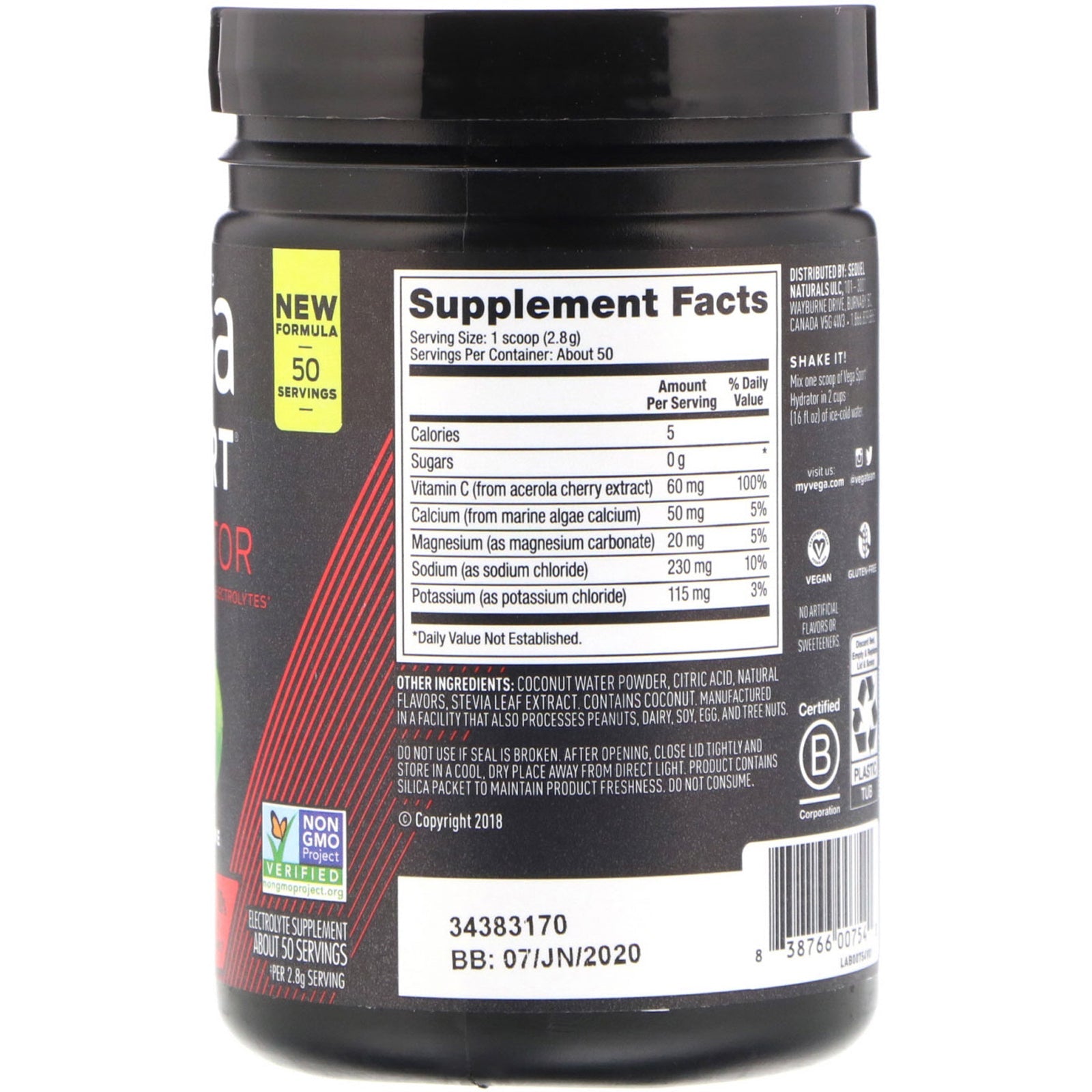 Plant Based 50 Servings Ingredients to Replenish Electrolytes Informed Choice Trusted by Sport. Org Non GMO Project Verified Electrolyte Supplement No Added Sugars 100% DV Vitamin C‡ Certified Vegan Gluten Free Certified B Corporation No Artificial Flavors or Sweeteners Made with Real Plant Based Food Ingredients Stay Hydrated Out There Electrolytes Only 5 Calories Vega Sport Nutrition System Fuel your better with Vega's three-stage performance nutrition system-pre, mid, and post workout Mid Workout Brendan Brazier: Vega Co-Founder and Original Formulator, Former Professional Ironman Triathlete & Bestselling Author. "Vega Grew from My Goal: To make plant-based nutrition easier for busy people. Since 2004, Vega has brought real, plant-based food ingredients together to help you get the nutrition your body wants, without compromise." ‡Per 2.8 g servingSugg. UseShake it! Mix one scoop of Vega Sport Hydrator in 2 cups (16 fl oz) of ice-cold water.Other IngredientsCoconut water powder, citric acid, natural flavors,...