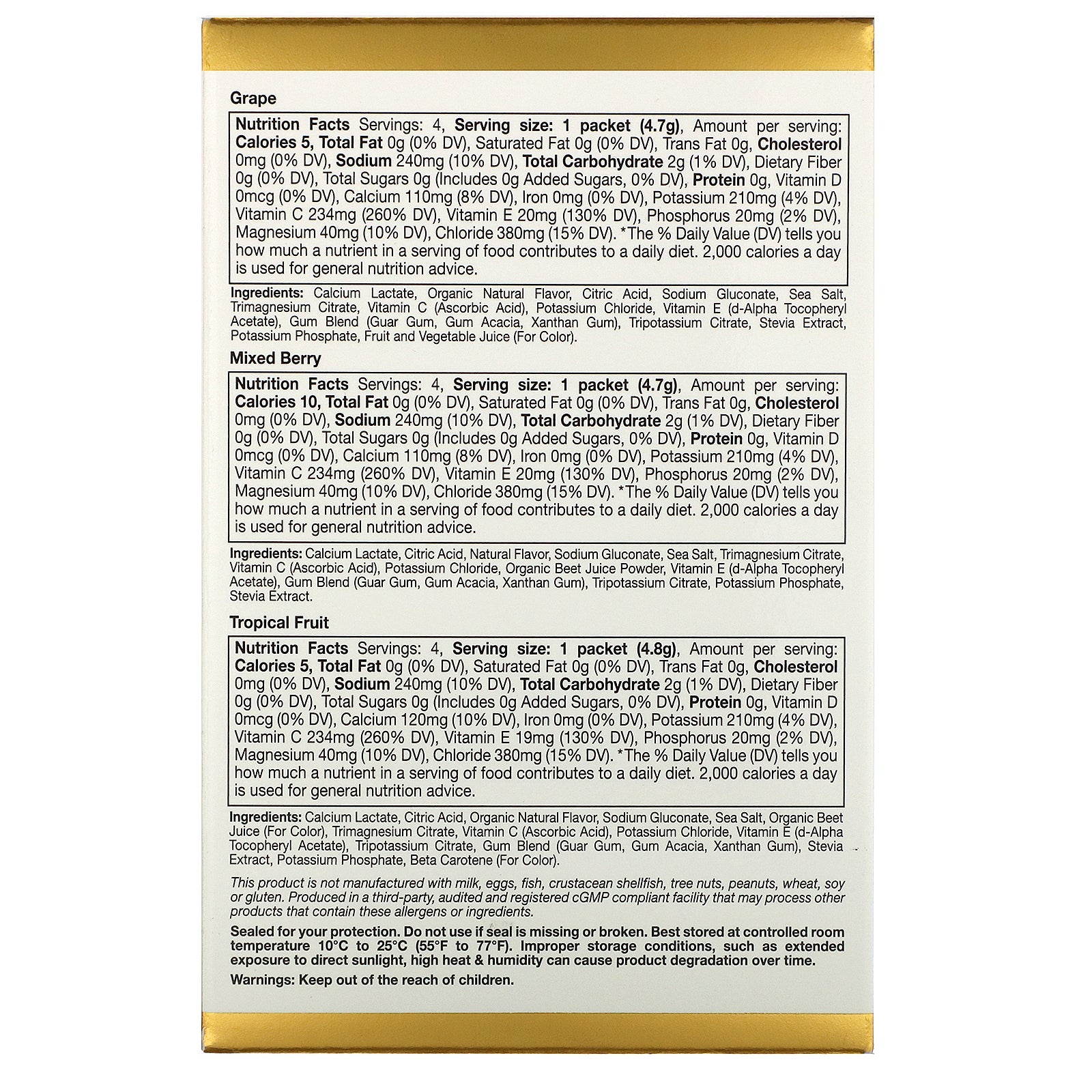 Grape Flavor Calcium Lactate, Organic Natural Flavor, Citric Acid, Sodium Gluconate, Sea Salt, Trimagnesium Citrate, Vitamin C (Ascorbic Acid), Potassium Chloride, Vitamin E (d-Alpha Tocopheryl Acetate), Gum Blend (Guar Gum, Gum Acacia, Xanthan Gum), Tripotassium Citrate, Stevia Extract, Potassium Phosphate, Fruit and Vegetable Juice (For Color). Mixed Berry Calcium Lactate, Citric Acid, Natural Flavor, Sodium Gluconate, Sea Salt, Trimagnesium Citrate, Vitamin C (Ascorbic Acid), Potassium Chloride, Organic Beet Juice Powder, Vitamin E (d-Alpha Tocopheryl Acetate), Gum Blend (Guar Gum, Gum Acacia, Xanthan Gum), Tripotassium Citrate, Potassium Phosphate, Stevia Extract. Tropical Fruit Calcium Lactate, Citric Acid, Organic Natural Flavor, Sodium Gluconate, Sea Salt, Organic Beet Juice (For Color), Trimagnesium Citrate, Vitamin C (Ascorbic Acid), Potassium Chloride, Vitamin E (d-Alpha Tocopheryl Acetate), Tripotassium Citrate, Gum Blend (Guar Gum, Gum Acacia, Xanthan Gum), Stevia Extract, Potassium Phosphate, Beta Carotene (For Color). Citrus Calcium Lactate, Citric Acid, Natural Flavor, Sodium Gluconate, Sea Salt, Trimagnesium Citrate, Vitamin C (Ascorbic Acid), Potassium Chloride, Vitamin E (d-Alpha Tocopheryl Acetate), Gum Blend (Guar Gum, Gum Acacia, Xanthan Gum), Tripotassium Citrate, Potassium Phosphate, Stevia Extract, Riboflavin 5-Phosphate Sodium (For Color). Fruit Punch Calcium Lactate, Sodium Gluconate, Citric Acid, Sea Salt, Natural Flavors, Trimagnesium Citrate, Vitamin C (Ascorbic Acid), Potassium Chloride, Vitamin E (d-Alpha Tocopheryl Acetate), Gum Blend (Guar Gum, Gum Acacia, Xanthan Gum), Tripotassium Citrate, Stevia Extract, Potassium Phosphate, Fruit and Vegetable Juice (For Color). This product is not manufactured with milk, eggs, fish, crustacean shellfish, tree nuts, peanuts, wheat, soy or gluten. Produced in a third-party, audited and registered cGMP compliant facility that may process other products that contain these allergens or ingredients.Supplement Facts