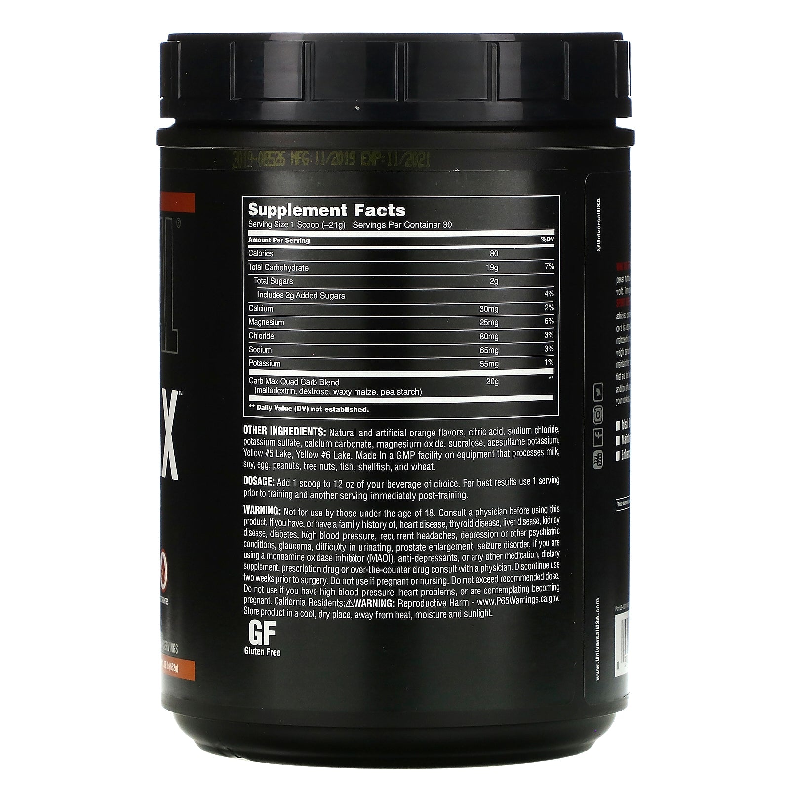 Serving Size: 1 Scoop (~21 g) Servings Per Container: 30 Amount Per Serving % DV Calories 80 Total Carbohydrate 19 g 6% Sugars 2 g Calcium 30 mg 3% Magnesium 25 mg 7% Sodium 60 mg 3% Chloride 80 mg 2% Potassium 55 mg 2% Carb Max Quad Carb Blend (maltodextrin, dextrose, waxy maize, pea starch) 20 g ** **Daily Value (DV) not established.Disclaimer