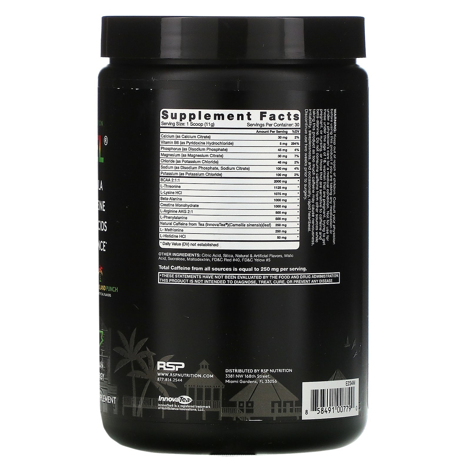 Serving Size: 1 Scoop (11 g) Serving Per Container : 30 Amount Per Serving %Daily Value Calcium (as Calcium Citrate) 30 mg 2% Vitamin B6 (as Pyridoxine Hydrochloride) 5 mg 294% Phosphorus (as Disodium Phosphate) 45 mg 4% Magnesium (as Magnesium Citrate) 30 mg 7% Chloride (as Potassium Chloride) 48 mg 2% Sodium (as Disodium Phosphate, Sodium Citrate) 100 mg 4% Potassium (as Potassium Chloride) 100 mg 2% BCAA 2:1:1 2000 mg * L-Threonine 1125 mg * L-Lysine HCI 1075 mg * Beta-Alanine 1000 mg * Creatine Monohydrate 1000 mg * L-Arginine AKG 2:1 500 mg * L-Phenylalanine 500 mg * Natural Caffeine from Tea (InnovaTea®) (Camellia sinensis) (leaf) 250 mg * L-Methionine 250 mg * L-Histidine HCI 50 mg * * Daily Value (DV) not establishedDisclaimer