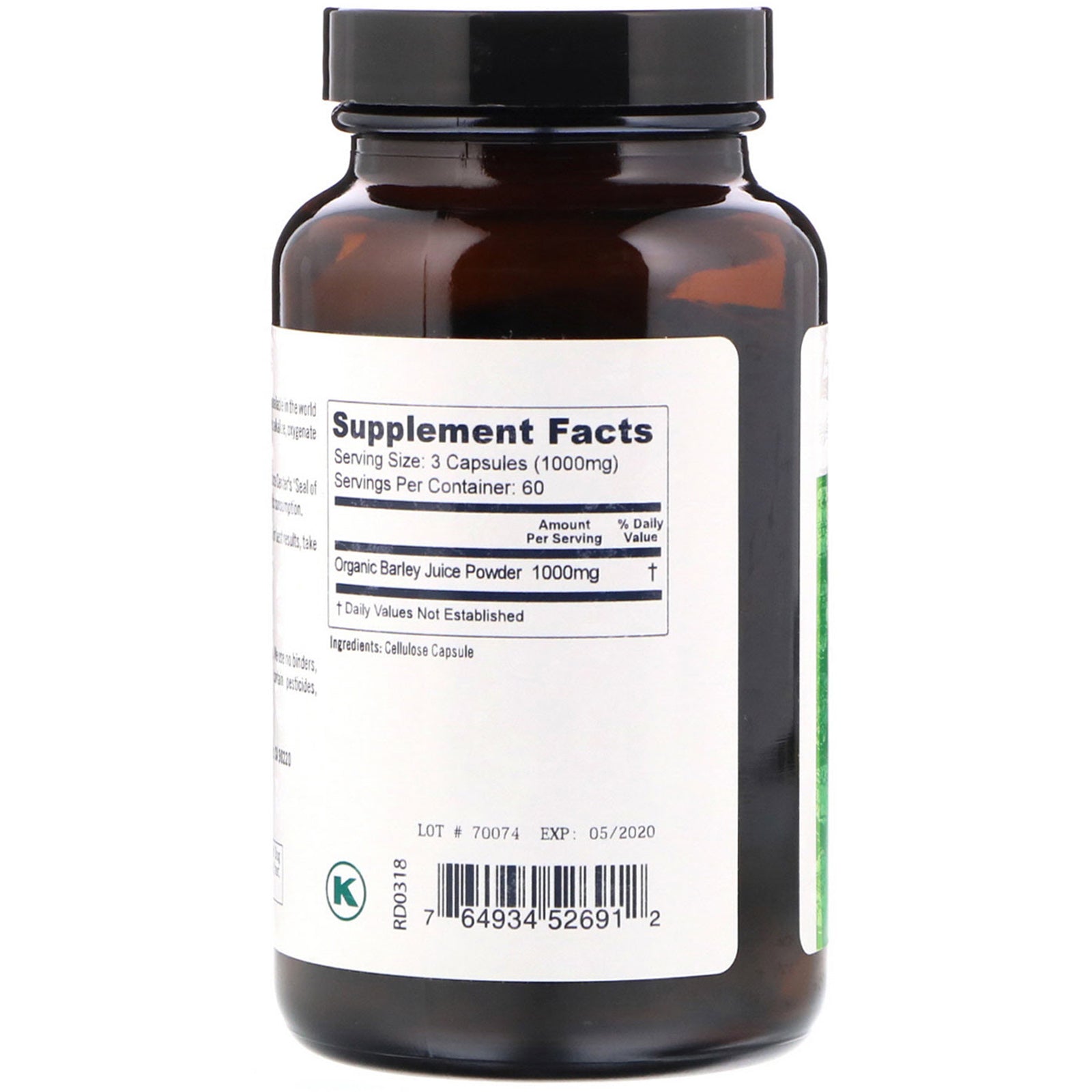 Cleanse With 100% Juice Powder Dietary Supplement Non-GMO Vegan Kosher Just Barley is perhaps the purest form of green food nutrition available in the world today. This 100% pure, raw, organically grown superfood helps alkalize, oxygenate and cleanse your body. Just Barley has been awarded the Diabetes Resource Center's "Seal of Approval" as a safe and beneficial food for diabetic consumption.Sugg. UseTake three capsules with 8 ounces of water. For best results, take on an empty stomach.Other IngredientsCellulose capsule. Pure planet products are pure, non GMO and 100% natural. We use no binders, fillers, excipients or flow agents. Our products never contain pesticides, herbicides or chemicals of any kind.Supplement FactsServing Size: 3 Capsules (1000 mg) Servings Per Container: 60 Amount Per Serv. % Daily Value Organic Barley Juice Powder 1000 mg † † Daily Value not established.DisclaimerWhile VitaminsUK strives to ensure the accuracy of its product images and information, some...