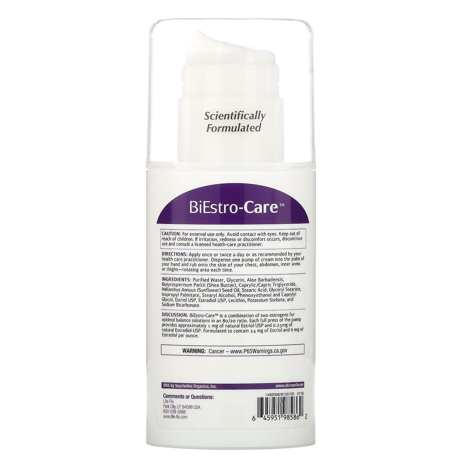 Pre-Measured Pump No Guessing How Much to Apply Paraben Free Beautiful Living With Estriol & Estradiol USP Optimal Balance Solutions 1st First Choice Women's Wellness Scientifically Formulated BiEstro-Care™ is a combination of two estrogens for optimal balance solutions in an 80/20 ratio. Each full press of the pump provides approximately 1 mg of natural Estriol USP and 0.25 mg of natural Estradiol USP. Formulated to contain 24 mg of Estriol and 6 mg of Estradiol per ounce.Sugg. UseApply once or twice a day or as recommended by your health care practitioner. Dispense one pump of cream into the palm of your hand and rub onto the skin of your chest, abdomen, inner arms or thighs—rotating area each time.Other IngredientsPurified water, glycerin, aloe barbadensis, butyrospermum parkii (shea butter), caprylic/capric triglyceride, helianthus annuus (sunflower) seed oil, stearic acid, glyceryl stearate, isopropyl palmitate, stearyl alcohol, phenoxyethanol and caprylyl glycol, estriol USP, estradiol USP,...