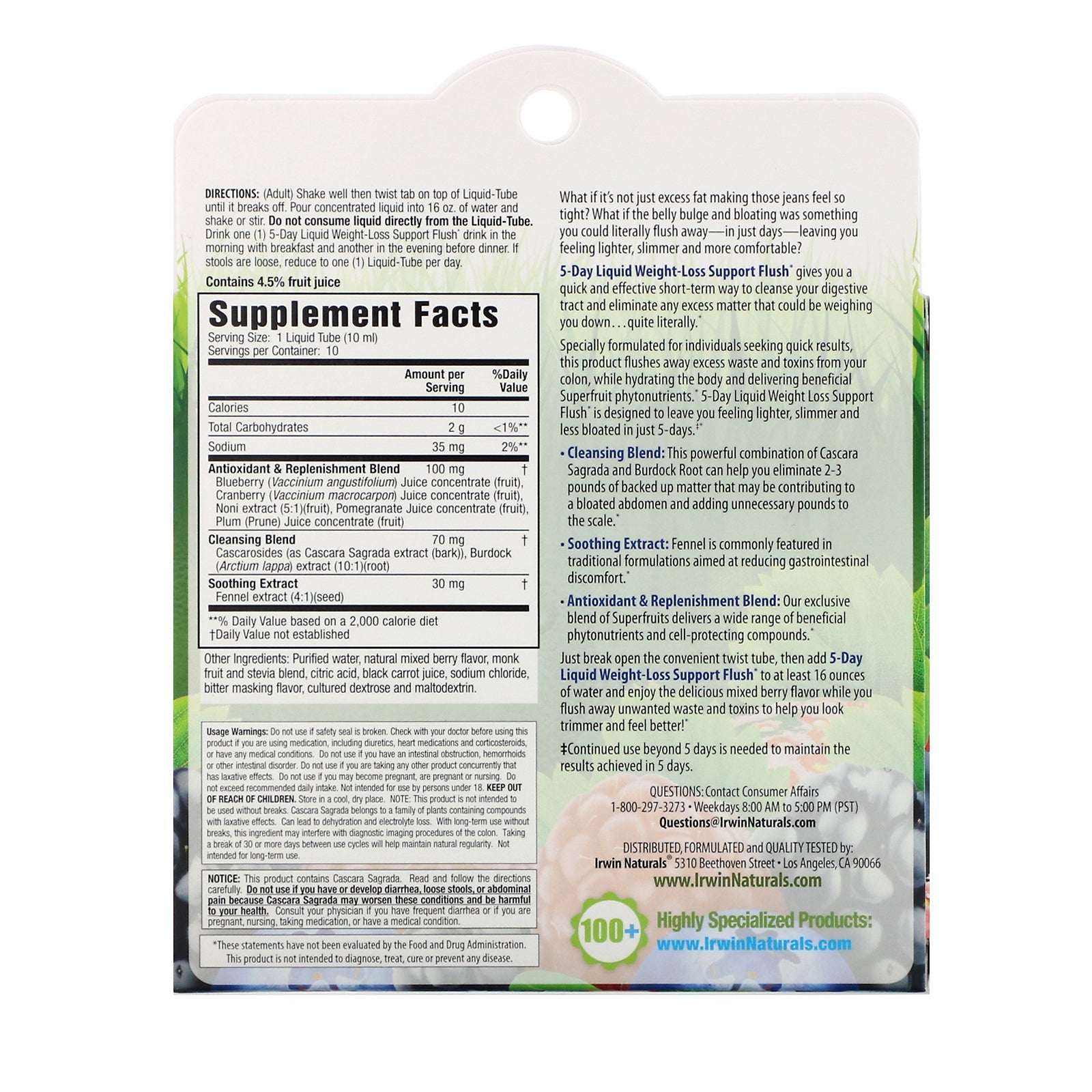Flush Up To 2-3 lbs of Backed-Up Matter Clogging Your Digestive System! Delicious Mixed Berry Flavored Concentrated Drink Mix Dietary Supplement One-Per-Day Drink Mix with : Cleansing Flush Blend Soothing Fennel Extract Antioxidant & Replenishment Blend What if it's not just excess fat making those jeans feel so tight? What if the belly bulge and bloating was something you could literally flush away-in just days-leaving you feeling lighter, slimmer and more comfortable? 5-Day Liquid Weight-Loss Support Flush gives you a quick and effective short-term way to cleanse your digestive tract and eliminate any excess matter that could be weighing you down...quite literally. Specially formulated for individuals seeking quick results, this product flushes away excess waste and toxins from your colon, while hydrating the body and delivering beneficial Superfruit phytonutrients. 5-Day Liquid Weight Loss Support Flush is designed to leave you feeling lighter, slimmer and less bloated in just 5-days.‡ Cleansing Blend : This powerful combination of Cascara Sagrada and Burdock Root can help you eliminate 2-3 pounds of backed up matter that may be contributing to a bloated abdomen and adding unnecessary pounds to the scale. Soothing Extract : Fennel is commonly featured in traditional formulations aimed at reducing gastrointestinal discomfort. Antioxidant & Replenishment Blend : Our exclusive blend of Superfruits delivers a wide range of beneficial phytonutrients and cell-protecting compounds. Just break open the convenient twist tube, then add 5-Day Liquid Weight-Loss Support Flush to at least 16 ounces of water and enjoy the delicious mixed berry flavor and while you flush away unwanted waste and toxins to help you look trimmer and feel better! ‡Continued use beyond 5 days is needed to maintain the results achieved in 5 days.
