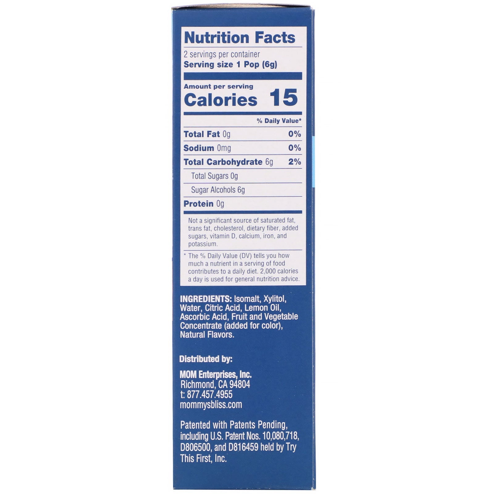 Serving Size: 1 Pop (6 g) Serving Per Container: 2 Amount Per Serving %Daily Value* Calories 15 Total Fat 0 g 0% Sodium 0 mg 0% Total Carbohydrate 6 g 2% Total Sugars 0 g Sugar Alcohols 6 g Protein 0 g Not a significant source of saturated fat, trans fat, cholesterol, dietary fiber, added sugars, vitamin D, calcium, iron, and potassium. *The % Daily Value (DV) tells you how much a nutrient in a serving of food contributes to a daily diet. 2,000 calories a day is used for general nutrition advice.Disclaimer