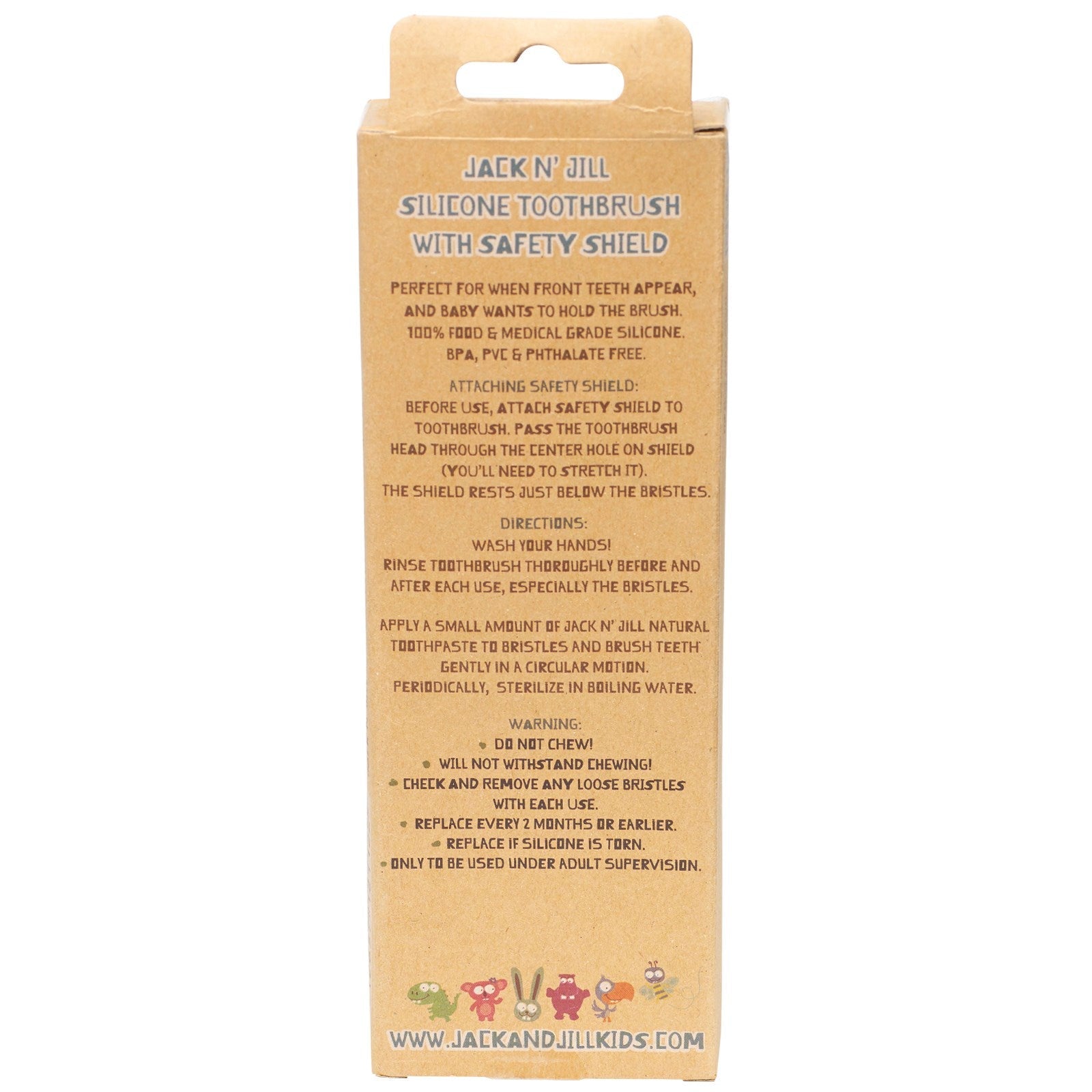 Soft (1 - 3 Yrs) BPA & PVC Free Safety Shield IncludedSugg. UseAttaching Safety Shield: Before use, attach safety shield to toothbrush. Pass the toothbrush head through the center hole on shield (you'll need to stretch it). The shield rests just below the bristles Directions: Wash your hands! Rinse toothbrush thoroughly before and after each use, especially the bristles. Periodically, sterilize in boiling water. Apply a small amount of Jack N' Jill natural toothpaste to bristles and brush teeth gently in a circular motion. Replace every 2 months or earlier. Replace after illness. Replace if silicone is torn. Only to be used under adult supervision. Do not chew! Will not withstand chewing!Other Ingredients100% food & medical grade silicone.Supplement FactsDisclaimerWhile VitaminsUK strives to ensure the accuracy of its product images and information, some manufacturing changes to packaging and/or ingredients may be pending update on our site. Although items may occasionally ship...